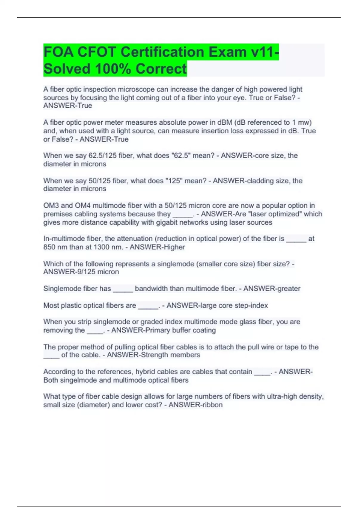 FOA CFOT Certification Exam v11 (100% correct answers) A fiber optic inspection microscope can increase the danger of high powered light sources by focusing the light coming out of a fiber into your eye. True or False? correct answers True A fiber optic power meter measures absolute power in dBM (dB referenced to 1 mw) and, when used with a light source, can measure insertion loss expressed in dB. True or False? correct answers True When we say 62.5/125 fiber, what does