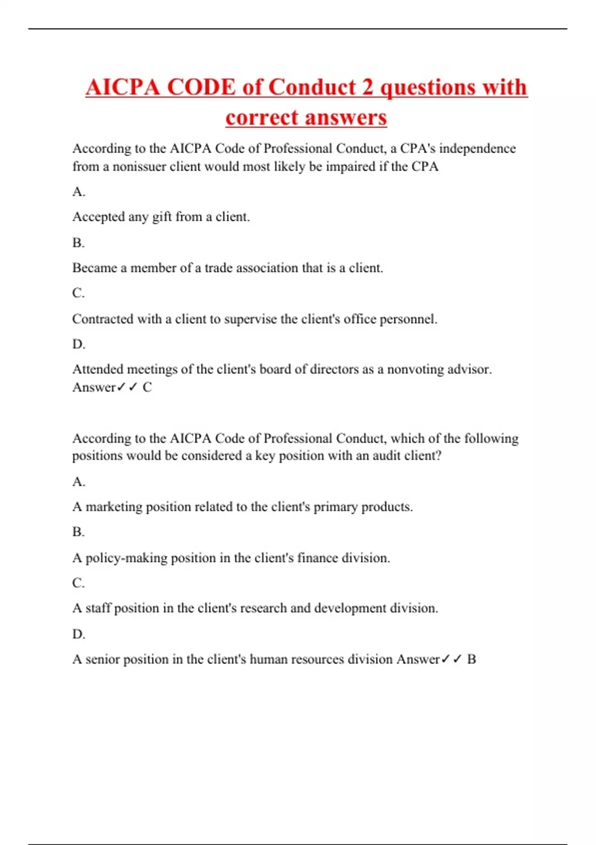 According to the AICPA Code of Professional Conduct, a CPA's independence from a nonissuer client would most likely be impaired if the CPA A. Accepted any gift from a client. B. Became a member of a trade association that is a client. C. Contracted with a client to supervise the client's office personnel. D. Attended meetings of the client's board of directors as a nonvoting advisor. Answer C According to the AICPA Code of Professional Conduct, which of the following positions would be considered a key position with an audit client? A. A marketing position related to the client's primary products. B. A policy-making position in the client's finance division. C. A staff position in the client's research and development division. D.