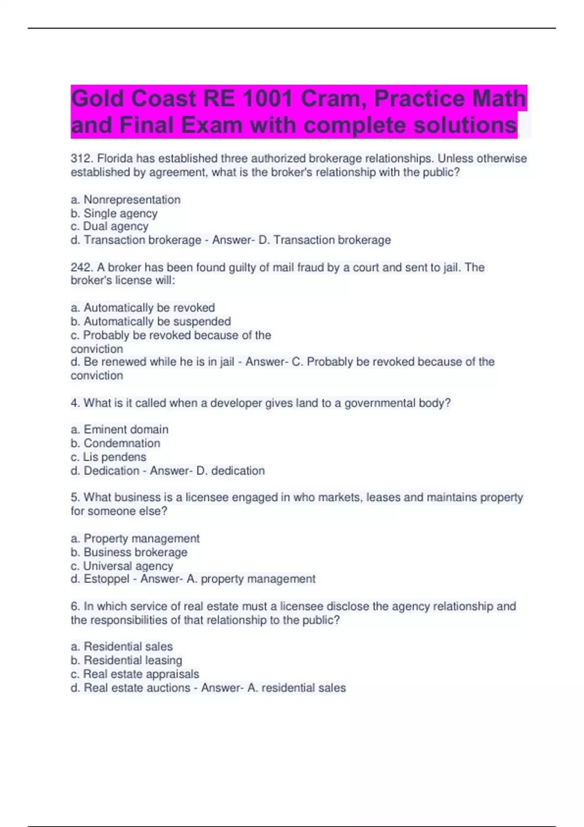 Gold Coast RE 1001 Cram, Practice Math and Final Exam with complete solutions