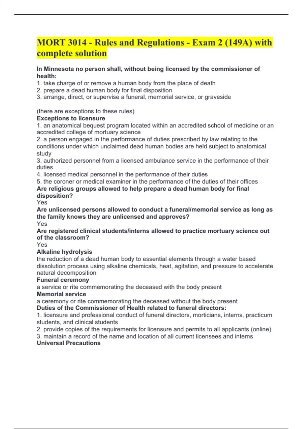 MORT 3014 - Rules and Regulations - Exam 2 (149A) with complete solution In Minnesota no person shall, without being licensed by the commissioner of health: 1. take charge of or remove a human body from the place of death 2. prepare a dead human body for final disposition 3. arrange, direct, or supervise a funeral, memorial service, or graveside (there are exceptions to these rules) Exceptions to licensure 1. an anatomical bequest program located within an accredited school of medicine or an accredited college of mortuary science 2. a person engaged in the performance of duties prescribed by law relating to the conditions under which unclaimed dead human bodies are held subject to anatomical study 3. authorized personnel from a licensed ambulance service in the performance of their duties 4. licensed medical personnel in the performance of their duties 5. the coroner or medical examiner in the performance of the duties of their offices Are religious groups allowed to help prepare a dead human body for final disposition? Yes Are unlicensed persons allowed to conduct a funeral/memorial service as long as the family knows they are unlicensed and approves? Yes Are registered clinical students/interns allowed to practice mortuary science out of the classroom? Yes Alkaline hydrolysis the reduction of a dead human body to essential elements through a water based dissolution process using alkaline chemicals, heat, agitation, and pressure to accelerate natural decomposition Funeral ceremony a service or rite commemorating the deceased with the body present Memorial service a ceremony or rite commemorating the deceased without the body present Duties of the Commissioner of Health related to funeral directors: 1. licensure and professional conduct of funeral directors, morticians, interns, practicum students, and clinical students 2. provide copies of the requirements for licensure and permits to all applicants (online) 3. maintain a record of the name and location of all current licensees and interns Universal Precautions universal blood and body fluid precautions recommended by the United States Public