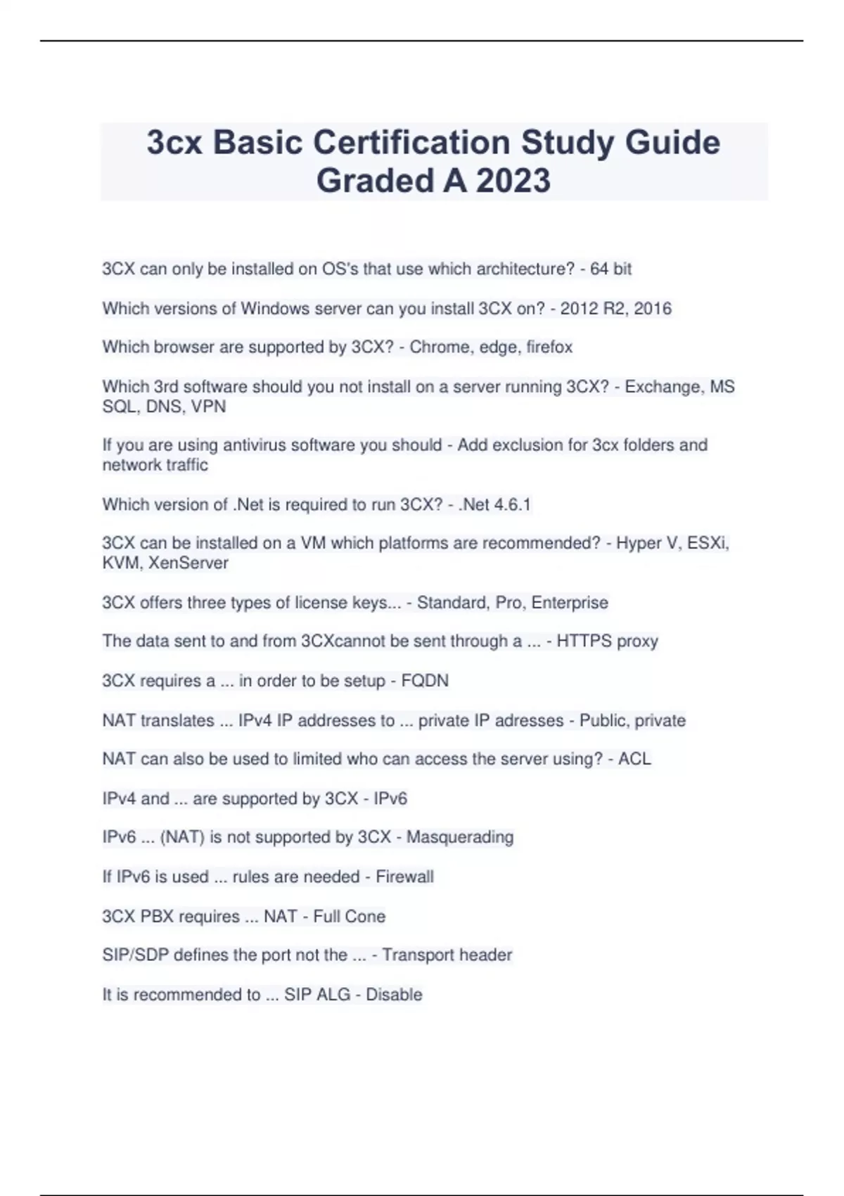 3CX can only be installed on OS's that use which architecture? - 64 bit Which versions of Windows server can you install 3CX on? - 2012 R2, 2016 Which browser are supported by 3CX? - Chrome, edge, firefox Which 3rd software should you not install on a server running 3CX? - Exchange, MS SQL, DNS, VPN If you are using antivirus software you should - Add exclusion for 3cx folders and network traffic Which version of .Net is required to run 3CX? - .Net 4.6.1 3CX can be installed on a VM which platforms are recommended? - Hyper V, ESXi, KVM, XenServer 3CX offers three types of license keys... - Standard, Pro, Enterprise The data sent to and from 3CXcannot be sent through a ... - HTTPS proxy 3CX requires a ... in order to be setup - FQDN NAT translates ... IPv4 IP addresses to ... private IP adresses - Public, private NAT can also be used to limited who can access the server using? - ACL IPv4 and ... are supported by 3CX - IPv6 IPv6 ... (NAT) is not supported by 3CX - Masquerading If IPv6 is used ... rules are needed - Firewall 3CX PBX requires ... NAT - Full Cone SIP/SDP defines the port not the ... - Transport header It is recommended to ... SIP ALG - Disable