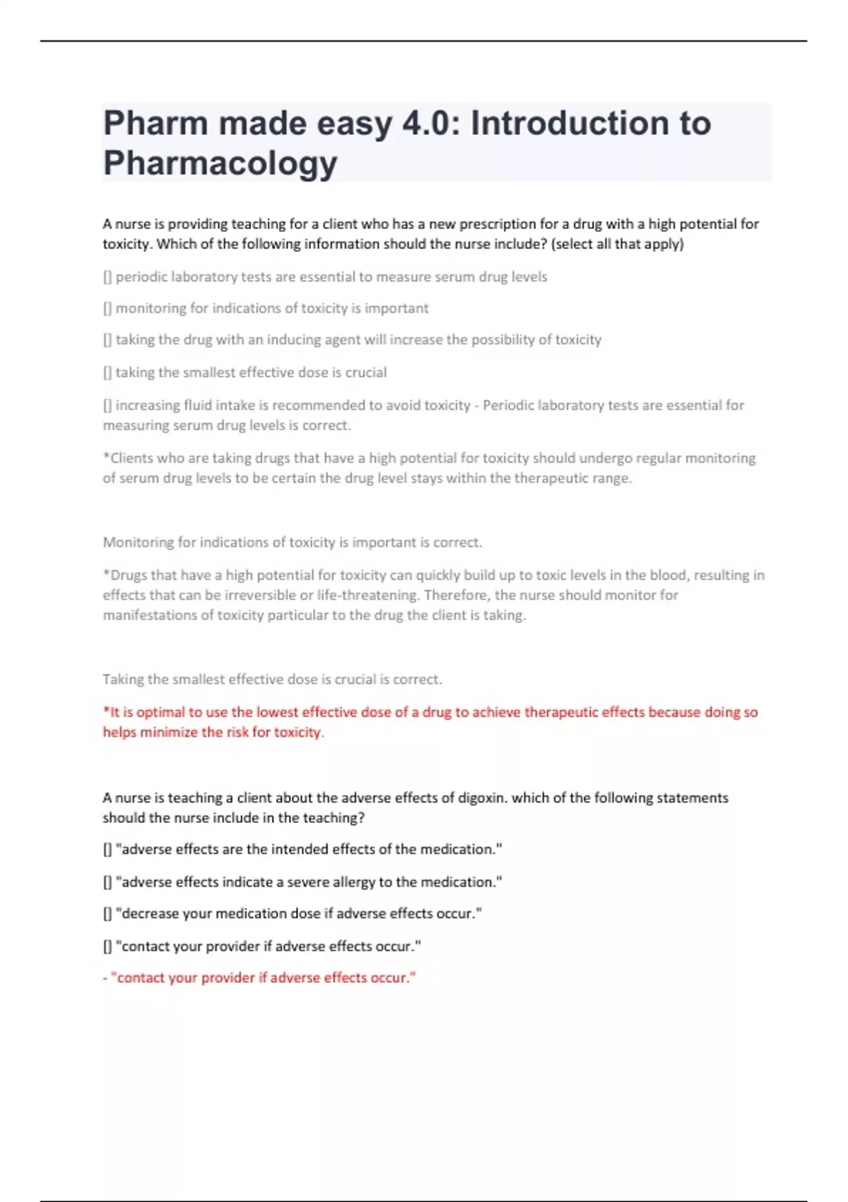 A nurse is providing teaching for a client who has a new prescription for a drug with a high potential for toxicity. Which of the following information should the nurse include? (select all that apply) [] periodic laboratory tests are essential to measure serum drug levels [] monitoring for indications of toxicity is important [] taking the drug with an inducing agent will increase the possibility of toxicity [] taking the smallest effective dose is crucial [] increasing fluid intake is recommended to avoid toxicity - Periodic laboratory tests are essential for measuring serum drug levels is correct. *Clients who are taking drugs that have a high potential for toxicity should undergo regular monitoring of serum drug levels to be certain the drug level stays within the therapeutic range. Monitoring for indications of toxicity is important is correct. *Drugs that have a high potential for toxicity can quickly build up to toxic levels in the blood, resulting in effects that can be irreversible or life-threatening. Therefore, the nurse should monitor for manifestations of toxicity particular to the drug the client is taking. Taking the smallest effective dose is crucial is correct. *It is optimal to use the lowest effective dose of a drug to achieve therapeutic effects because doing so helps minimize the risk for toxicity. A nurse is teaching a client about the adverse effects of digoxin. which of the following statements should the nurse include in the teaching? [] "adverse effects are the intended effects of the medication." [] "adverse effects indicate a severe allergy to the medication." [] "decrease your medication dose if adverse effects occur." [] "contact your provider if adverse effects occur." - "contact your provider if adverse effects occur."A nurse is caring for a client who has a history of renal insufficiency and is taking lithium. The nurse should monitor the client for which of the following? [] tolerance to the drug [] drug interaction [] drug toxicity [] dependence on the drug - Drug toxicity Drug toxicity develops when the amount of a drug that is taken is greater than its rate of excretion, and it results in the drug accumulating in the body. A client who has renal insufficiency might have delayed or impaired excretion of the drug. The drug dosage should be reduced if toxicity occurs. A nurse is teaching a client about naproxen enteric-coated tablets. Which of the following statements should the nurse include in the teaching? [] "drug absorption occurs in the stomach." [] "you should expect immediate absorption of the drug." [] "you should allow the tablet to dissolve in your mouth." [] "do not crush or chew the tablet." - "do not crush or chew the tablet.