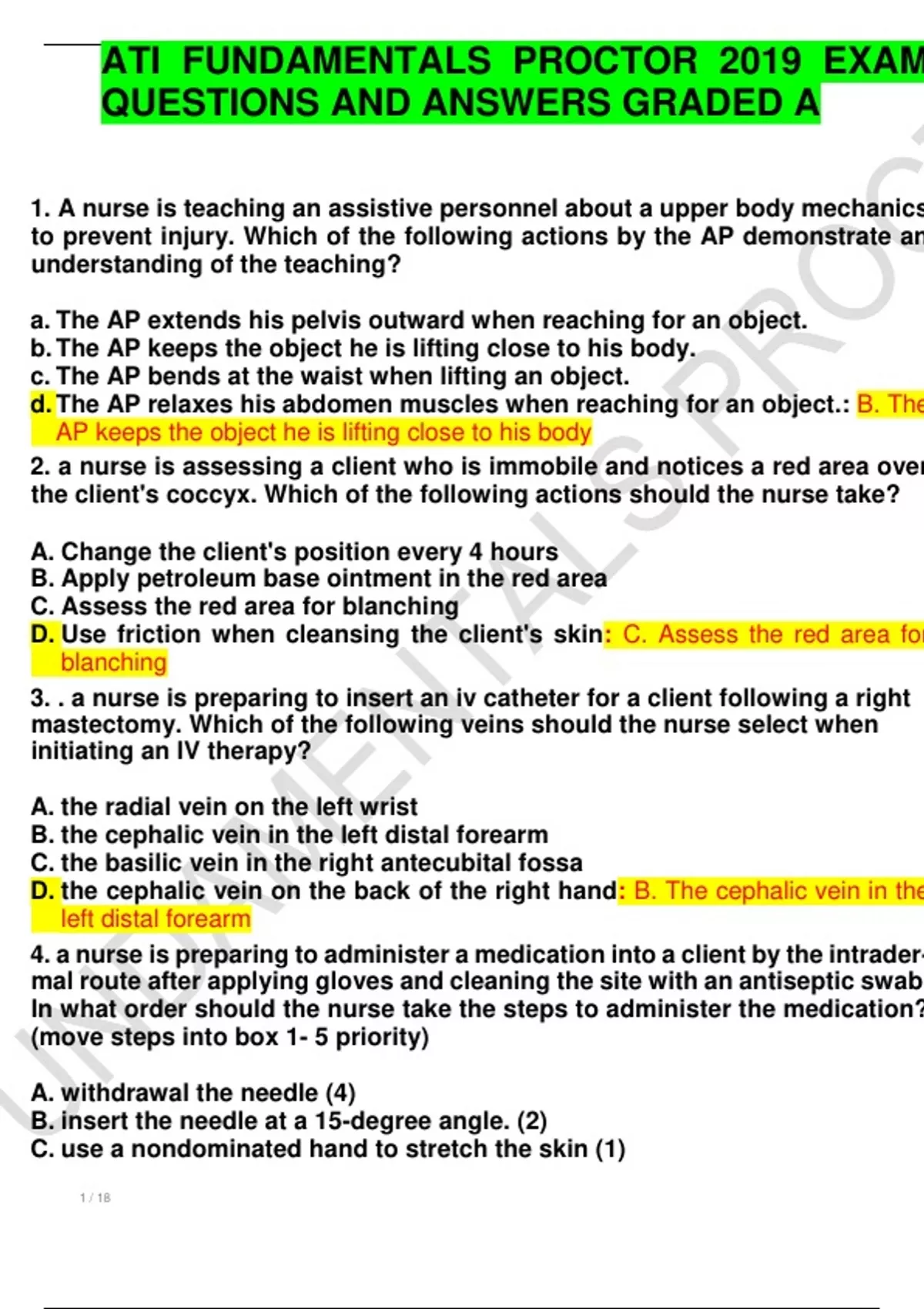 1. A nurse is teaching an assistive personnel about a upper body mechanics to prevent injury. Which of the following actions by the AP demonstrate an understanding of the teaching? a. The AP extends his pelvis outward when reaching for an object. b. The AP keeps the object he is lifting close to his body. c. The AP bends at the waist when lifting an object. d. The AP relaxes his abdomen muscles when reaching for an object.: B. The AP keeps the object he is lifting close to his body 2. a nurse is assessing a client who is immobile and notices a red area over the client's coccyx. Which of the following actions should the nurse take? A. Change the client's position every 4 hours B. Apply petroleum base ointment in the red area C. Assess the red area for blanching D. Use friction when cleansing the client's skin: C. Assess the red area for blanching 3. . a nurse is preparing to insert an iv catheter for a client following a right mastectomy. Which of the following veins should the nurse select when initiating an IV therapy? A. the radial vein on the left wrist B. the cephalic vein in the left distal forearm C. the basilic vein in the right antecubital fossa D. the cephalic vein on the back of the right hand: B. The cephalic vein in the left distal forearm 4. a nurse is preparing to administer a medication into a client by the intrader- mal route after applying gloves and cleaning the site with an antiseptic swab. In what order should the nurse take the steps to administer the medication? (move steps into box 1- 5 priority)