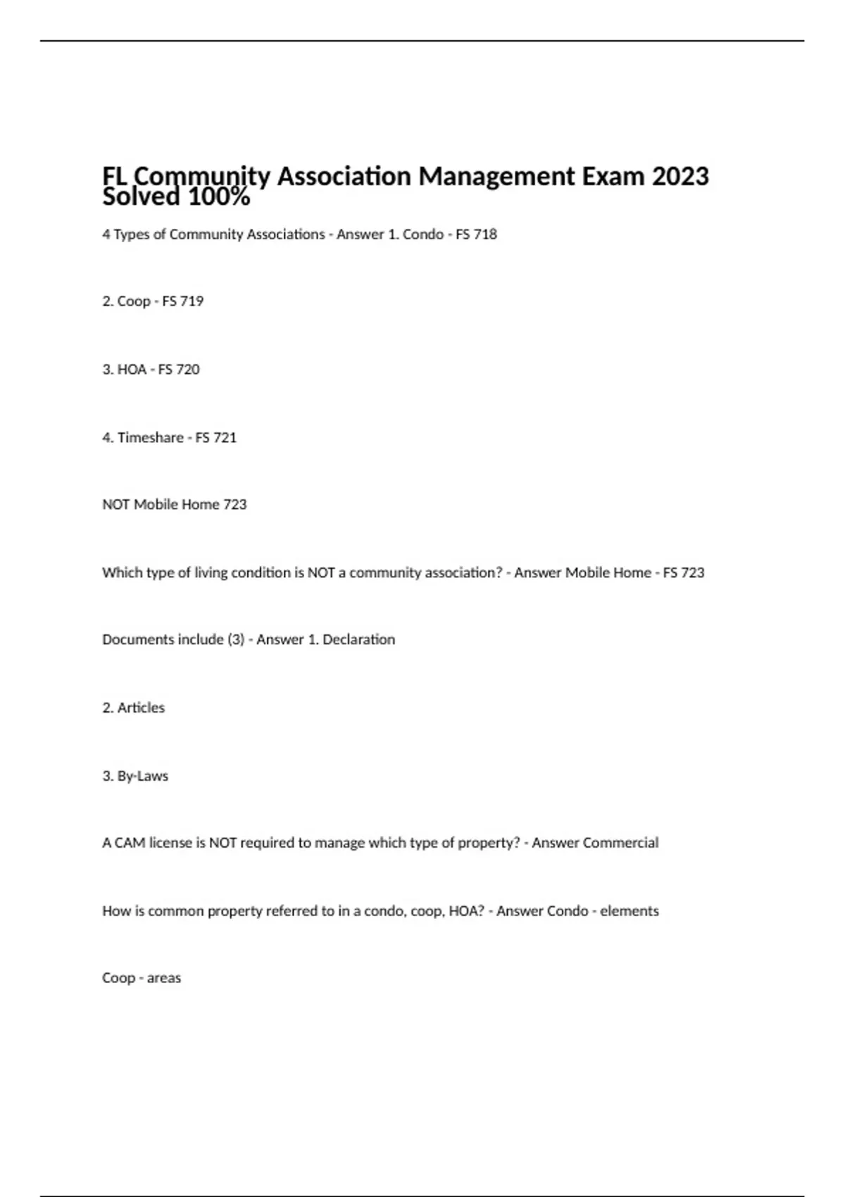 4 Types of Community Associations - Answer 1. Condo - FS 718 2. Coop - FS 719 3. HOA - FS 720 4. Timeshare - FS 721 NOT Mobile Home 723 Which type of living condition is NOT a community association? - Answer Mobile Home - FS 723 Documents include (3) - Answer 1. Declaration 2. Articles 3. By-Laws A CAM license is NOT required to manage which type of property? - Answer Commercial How is common property referred to in a condo, coop, HOA? - Answer Condo - elements Coop - areas HOA - property Which Florida Statute addresses CAM Licensure Law and Natural Person & Management Company - Answer FS 468 - part VIII Under what 2 conditions is a CAM license is required in Florida? - Answer 1. When receiving compensation 2. When association has over 10 units and/or a budget over $100, 000 What do the 3 governing Documents define? - Answer 1. Declaration - ownership 2. Articles of Incorporation - structure (creates assoc usually not for profit - FS 617) 3. By Laws - day to day operations (rules and regulations) The Declaration is FILED with the - Answer Clerk of Court (county) in county/counties where structure is located CAM services include which 16 practices? - Answer 1. Funds - control