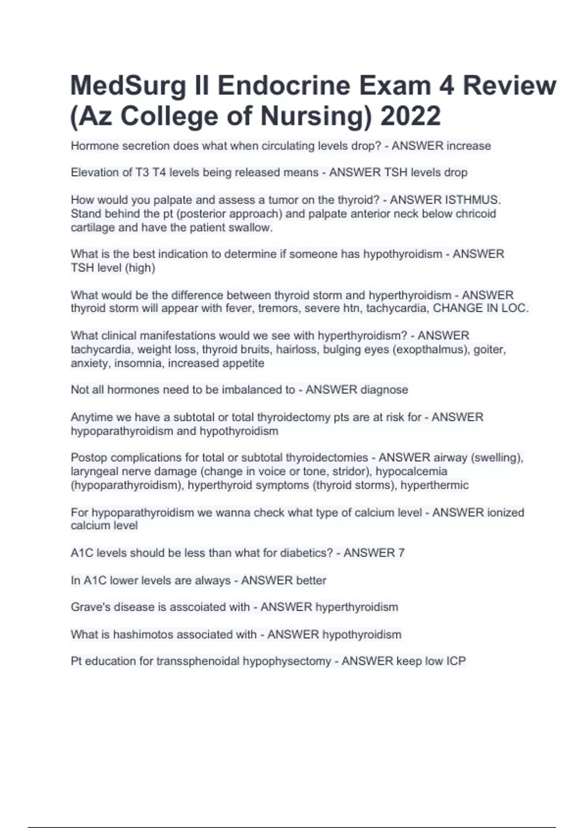 MedSurg II Endocrine Exam 4 Review (Az College of Nursing) 2022. Hormone secretion does what when circulating levels drop? - ANSWER increase Elevation of T3 T4 levels being released means - ANSWER TSH levels drop How would you palpate and assess a tumor on the thyroid? - ANSWER ISTHMUS. Stand behind the pt (posterior approach) and palpate anterior neck below chricoid cartilage and have the patient swallow. What is the best indication to determine if someone has hypothyroidism - ANSWER TSH level (high) What would be the difference between thyroid storm and hyperthyroidism - ANSWER thyroid storm will appear with fever, tremors, severe htn, tachycardia, CHANGE IN LOC. What clinical manifestations would we see with hyperthyroidism? - ANSWER tachycardia, weight loss, thyroid bruits, hairloss, bulging eyes (exopthalmus), goiter, anxiety, insomnia, increased appetite Not all hormones need to be imbalanced to - ANSWER diagnose Anytime we have a subtotal or total thyroidectomy pts are at risk for - ANSWER hypoparathyroidism and hypothyroidism Postop complications for total or subtotal thyroidectomies - ANSWER airway (swelling), laryngeal nerve damage (change in voice or tone, stridor), hypocalcemia (hypoparathyroidism), hyperthyroid symptoms (thyroid storms), hyperthermic For hypoparathyroidism we wanna check what type of calcium level - ANSWER ionized calcium level A1C levels should be less than what for diabetics? - ANSWER 7 In A1C lower levels are always - ANSWER better Grave's disease is asscoiated with - ANSWER hyperthyroidism.
