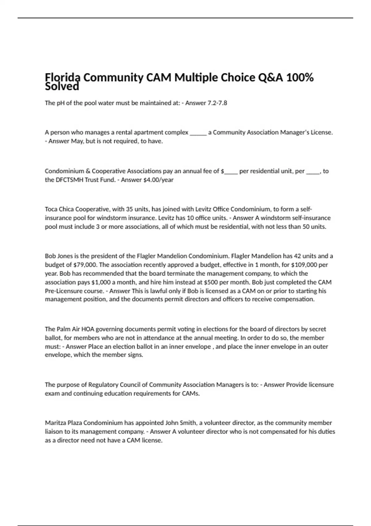Florida Community CAM Multiple Choice Q&A 100% Solved