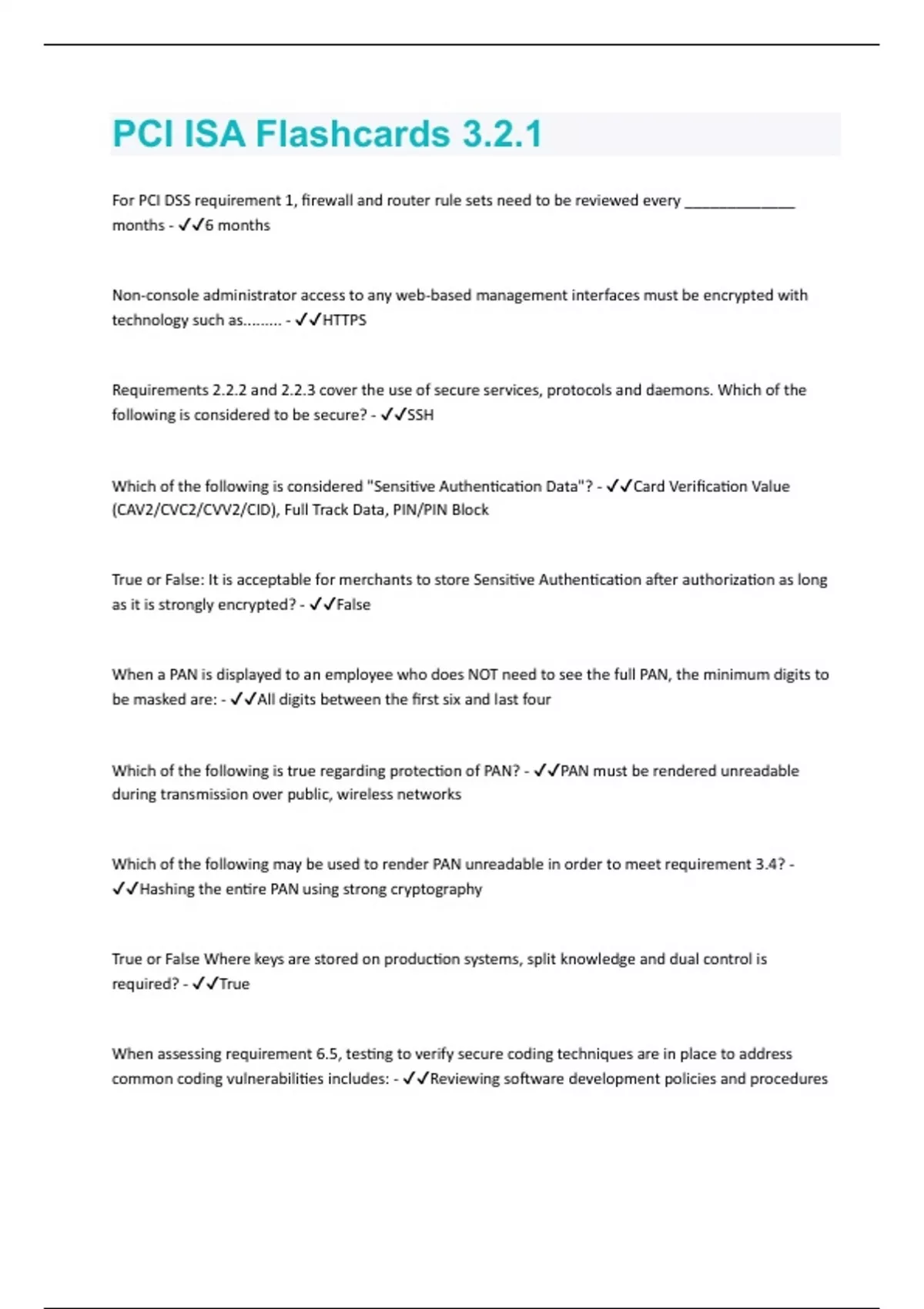 For PCI DSS requirement 1, firewall and router rule sets need to be reviewed every _____________ months - 6 months Non-console administrator access to any web-based management interfaces must be encrypted with technology such as......... - HTTPS Requirements 2.2.2 and 2.2.3 cover the use of secure services, protocols and daemons. Which of the following is considered to be secure? - SSH Which of the following is considered "Sensitive Authentication Data"? - Card Verification Value (CAV2/CVC2/CVV2/CID), Full Track Data, PIN/PIN Block True or False: It is acceptable for merchants to store Sensitive Authentication after authorization as long as it is strongly encrypted? - False When a PAN is displayed to an employee who does NOT need to see the full PAN, the minimum digits to be masked are: - All digits between the first six and last four Which of the following is true regarding protection of PAN? - PAN must be rendered unreadable during transmission over public, wireless networks Which of the following may be used to render PAN unreadable in order to meet requirement 3.4? - Hashing the entire PAN using strong cryptography True or False Where keys are stored on production systems, split knowledge and dual control is req