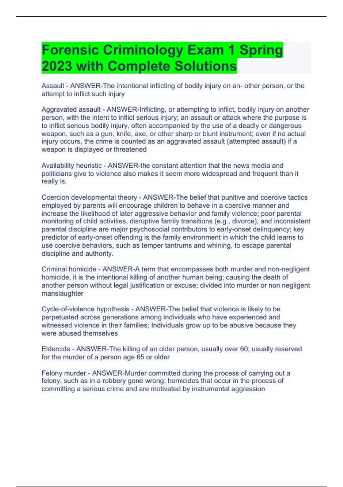 Assault - ANSWER-The intentional inflicting of bodily injury on an- other person, or the attempt to inflict such injury Aggravated assault - ANSWER-Inflicting, or attempting to inflict, bodily injury on another person, with the intent to inflict serious injury; an assault or attack where the purpose is to inflict serious bodily injury, often accompanied by the use of a deadly or dangerous weapon, such as a gun, knife, axe, or other sharp or blunt instrument; even if no actual injury occurs, the crime is counted as an aggravated assault (attempted assault) if a weapon is displayed or threatened Availability heuristic - ANSWER-the constant attention that the news media and politicians give to violence also makes it seem more widespread and frequent than it really is. Coercion developmental theory - ANSWER-The belief that punitive and coercive tactics employed by parents will encourage children to behave in a coercive manner and increase the likelihood of later aggressive behavior and family violence; poor parental monitoring of child activities, disruptive family transitions (e.g., divorce), and inconsistent parental discipline are major psychosocial contributors to early-onset delinquency; key predictor of early-onset offending is the family environment in which the child learns to use coercive behaviors, such as temper tantrums and whining, to escape parental discipline and authority. Criminal homicide - ANSWER-A term that encompasses both murder and non-negligent homicide, it is the intentional killing of another human being; causing the death of another person without legal justification or excuse; divided into murder or non negligent manslaughter Cycle-of-violence hypothesis - ANSWER-The belief that violence is likely to be perpetuated across generations among individuals who have experienced and witnessed violence in their families; Individuals grow up to be abusive because they were abused themselves Eldercide - ANSWER-The killing of an older person, usually over 60; usually reserved for the murder of a person age 65 or older Felony murder - ANSWER-Murder committed during the process of carrying out a felony, such as in a robbery gone wrong; homicides that occur in the process of committing a serious crime and are motivated by instrumental aggression