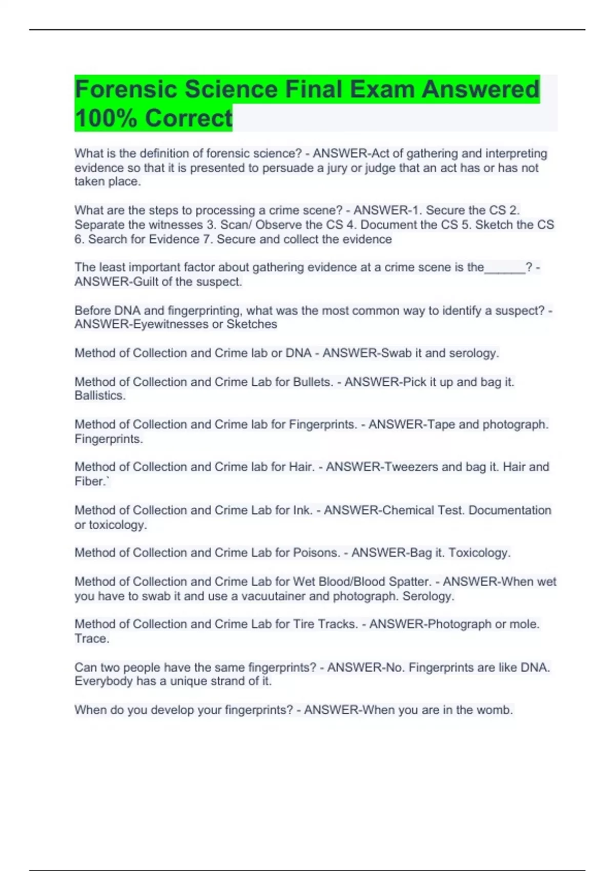 What is the definition of forensic science? - ANSWER-Act of gathering and interpreting evidence so that it is presented to persuade a jury or judge that an act has or has not taken place. What are the steps to processing a crime scene? - ANSWER-1. Secure the CS 2. Separate the witnesses 3. Scan/ Observe the CS 4. Document the CS 5. Sketch the CS 6. Search for Evidence 7. Secure and collect the evidence The least important factor about gathering evidence at a crime scene is the______? - ANSWER-Guilt of the suspect. Before DNA and fingerprinting, what was the most common way to identify a suspect? - ANSWER-Eyewitnesses or Sketches Method of Collection and Crime lab or DNA - ANSWER-Swab it and serology. Method of Collection and Crime Lab for Bullets. - ANSWER-Pick it up and bag it. Ballistics. Method of Collection and Crime lab for Fingerprints. - ANSWER-Tape and photograph. Fingerprints. Method of Collection and Crime lab for Hair. - ANSWER-Tweezers and bag it. Hair and Fiber.` Method of Collection and Crime Lab for Ink. - ANSWER-Chemical Test. Documentation or toxicology. Method of Collection and Crime Lab for Poisons. - ANSWER-Bag it. Toxicology. Method of Collection and Crime Lab for Wet Blood/Blood Spatter. - ANSWER-When wet you have to swab it and use a vacuutainer and photograph. Serology. Method of Collection and Crime Lab for Tire Tracks. - ANSWER-Photograph or mole. Trace. Can two people have the same fingerprints? - ANSWER-No. Fingerprints are like DNA. Everybody has a unique strand of it. When do you develop your fingerprints? - ANSWER-When you are in the womb.
