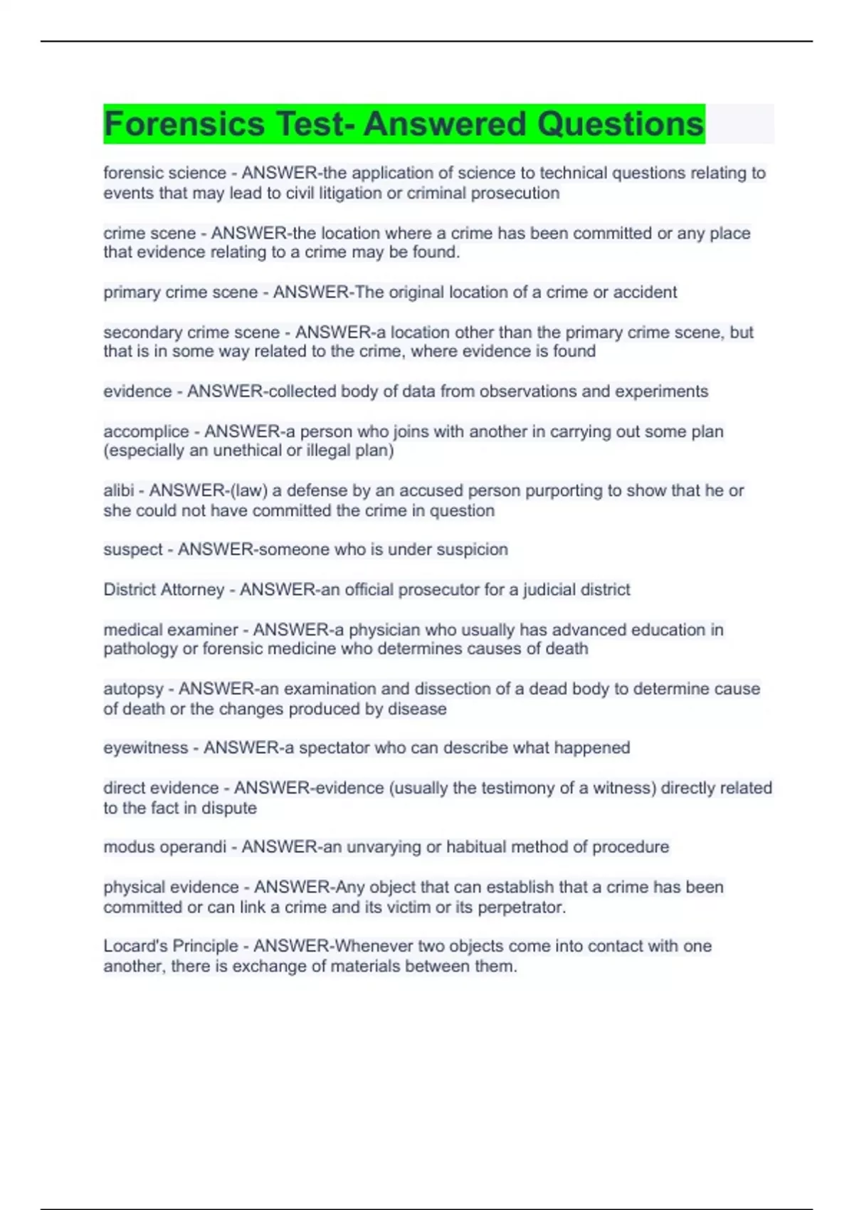 forensic science - ANSWER-the application of science to technical questions relating to events that may lead to civil litigation or criminal prosecution crime scene - ANSWER-the location where a crime has been committed or any place that evidence relating to a crime may be found. primary crime scene - ANSWER-The original location of a crime or accident secondary crime scene - ANSWER-a location other than the primary crime scene, but that is in some way related to the crime, where evidence is found evidence - ANSWER-collected body of data from observations and experiments accomplice - ANSWER-a person who joins with another in carrying out some plan (especially an unethical or illegal plan) alibi - ANSWER-(law) a defense by an accused person purporting to show that he or she could not have committed the crime in question suspect - ANSWER-someone who is under suspicion District Attorney - ANSWER-an official prosecutor for a judicial district medical examiner - ANSWER-a physician who usually has advanced education in pathology or forensic medicine who determines causes of death autopsy - ANSWER-an examination and dissection of a dead body to determine cause of death or the changes produced by disease eyewitness - ANSWER-a spectator who can describe what happened direct evidence - ANSWER-evidence (usually the testimony of a witness) directly related to the fact in dispute modus operandi - ANSWER-an unvarying or habitual method of procedure physical evidence - ANSWER-Any object that can establish that a crime has been committed or can link a crime and its victim or its perpetrator. Locard's Principle - ANSWER-Whenever two objects come into contact with one another, there is exchange of materials between them.