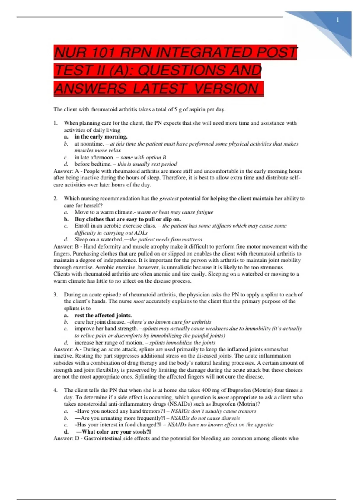NUR 101 RPN INTEGRATED POST TEST II (A): QUESTIONS AND ANSWERS LATEST VERSION AND RATIONALES/NUR 101 RPN INTEGRATED POST TEST II (A): QUESTIONS AND ANSWERS LATEST VERSION AND RATIONALES/NUR 101 RPN INTEGRATED POST TEST II (A): QUESTIONS AND ANSWERS LATEST VERSION AND RATIONALES