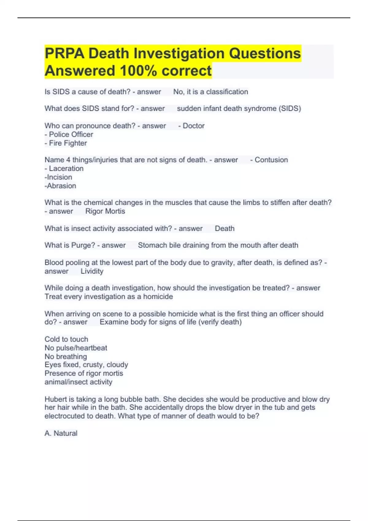 PRPA Death Investigation Questions Answered 100% correct Is SIDS a cause of death? No, it is a classification What does SIDS stand for? sudden infant death syndrome (SIDS) Who can pronounce death? - Doctor - Police Officer - Fire Fighter Name 4 things/injuries that are not signs of death. - Contusion - Laceration -Incision -Abrasion What is the chemical changes in the muscles that cause the limbs to stiffen after death? Rigor Mortis What is insect activity associated with? Death What is Purge? Stomach bile draining from the mouth after death Blood pooling at the lowest part of the body due to gravity, after death, is defined as? Lividity While doing a death investigation, how should the investigation be treated? Treat every investigation as a homicide When arriving on scene to a possible homicide what is the first thing an officer should do? Examine body for signs of life (verify death) Cold to touch No pulse/heartbeat No breathing Eyes fixed, crusty, cloudy Presence of rigor mortis animal/insect activity Hubert is taking a long bubble bath. She decides she would be productive and blow dry her hair while in the bath. She accidentally drops the blow dryer in the tub and gets electrocuted to death. What type of manner of death would to be? A. Natural B. Homicide C. Accidental D. Auto-Erotic C. Accidental Gonzalez took six PCP pills and wanted to drive to Mexico. Later, police find Gonzalez dead in the back seat of the vehicle but no blood or injuries. What type of death occurred? A. Natural B. Homicide C. Accidental D. Pended D. Pended- need examination to find cause of death When Caron attempts to choke himself and perform self-pleasure but ends up killing himself. what type of accidental death is that? A. Natural B. Homicide C. Accidental D. Auto-Erotic D. Auto-Erotic What type of manner of death would be the person died of heart attack or diabetes? A. Natural B. Homicide C. Accidental D. Suicide A. Natural Death Emily slashed her wrist but was able to be rushed to the hospital and be stabilized. What manner of death was Emily attempting to perform? A. Natural B. Homicide C. Accidental D. Suicide D. Suicide Smith is lifting weights and McCannon comes and asks for some pre-workout. Smith gets mad and beats McCannon with a dumbbell to death. What manner of death was used? A. Natural B. Homicide C. Accidental D. Suicide B. Homicide Who should apparent natural deaths be referred to? Medical Examiner When there are no signs of foul play or natural death what manner of death could be concluded? A. Natural B. Unknown C. Accidental D. Suicide B. Unknown A region of injured tissue or skin in which blood capillaries have been ruptured; a bruise. A. Contusion B. Abrasion C. Laceration A. Contusion A deep cut or tear in skin or flesh. A. Ante Mortem B. Abrasion C. Laceration C. Laceration An area damaged by scraping or wearing away A. Ante Mortem B. Abrasion C. Laceration B. Abrasion Having been inflicted or having occurred before death is? A. Ante Mortem B. Abrasion C. Laceration A. Ante mortem A surgical cut made in skin or flesh A. Incision B. Abrasion C. Laceration A. Incision Rigor mortis is: A. surgical cut made in skin or flesh B. stiffening of the joints and muscles of a body a few hours after death, usually lasting from one to four days. C. area damaged by scraping or wearing away B. stiffening of the joints and muscles of a body a few hours after death, usually lasting from one to four days. Examination of a dead body to determine the cause of death. A. Ante Mortem B. Pre Mortem C. Post Mortem C. Post Mortem You walk into a home and see a (verified dead) man looking like he froze while doing the robot. What could you say has set in? Rigor mortis When arriving to a suicide scene what are some special considerations for conducting an investigation? ( PO5.7.6) 1. Collect any drugs/medications and/or drug/medication containers 2. Obtain information as to the victim's psychological/emotional history 3. Obtain information as to any prior suicide attempts. What should officers do to a weapon when the area is secure and may be a possible homicide? Nothing, Leaving for the Homicide Agents What usually occurs during sleeping, within 1 year of birth, no visible signs of trauma and healthy child? Sudden Infant Death Syndrome (SIDS) Describing the physical condition and location of body is important when conducting what? A. SIDS B. Death Investigation C. Lividity B. Death Investigation Frothy or blood-tinged mucous or vomit may be present in, or around, the nose and/or mouth is a sign of death for what? A. Ante Mortem B. SIDS C. Post Mortem B. SIDS When having multiple witnesses on a crime scene involving death what should you do to them? A. Separate them B. Put them together C. Book them A. Separate Them A.R.S. 11-593 states what? Reporting of certain deaths; failure to report Do not state cause of death. (this can only be completed by the _____ ______). A. Sergeant On-Duty B. Medical Examiner C. Fire department B. Medical Examiner What are the five manners of death? 1. Natural 2. Homicide 3. Accidental/ auto-erotic 4. Unknown/ pended- needs more examination to determine death 5. Suicide