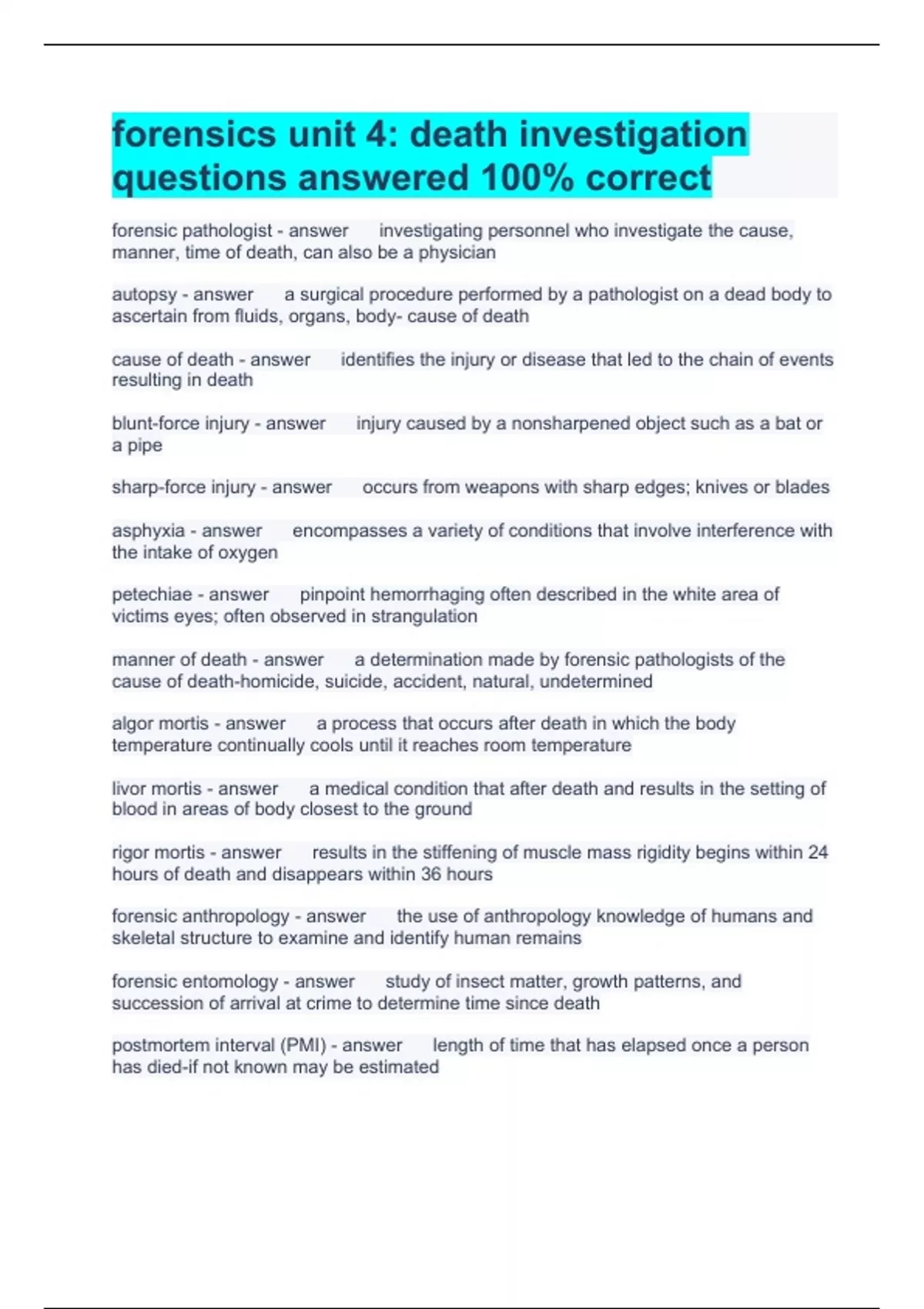 forensics unit 4: death investigation questions answered 100% correct