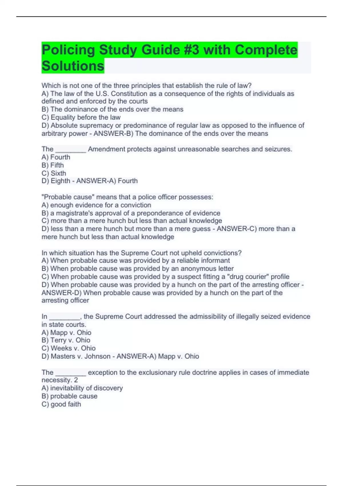 Which is not one of the three principles that establish the rule of law? A) The law of the U.S. Constitution as a consequence of the rights of individuals as defined and enforced by the courts B) The dominance of the ends over the means C) Equality before the law D) Absolute supremacy or predominance of regular law as opposed to the influence of arbitrary power - ANSWER-B) The dominance of the ends over the means The ________ Amendment protects against unreasonable searches and seizures. A) Fourth B) Fifth C) Sixth D) Eighth - ANSWER-A) Fourth "Probable cause" means that a police officer possesses: A) enough evidence for a conviction B) a magistrate's approval of a preponderance of evidence C) more than a mere hunch but less than actual knowledge D) less than a mere hunch but more than a mere guess - ANSWER-C) more than a mere hunch but less than actual knowledge In which situation has the Supreme Court not upheld convictions? A) When probable cause was provided by a reliable informant B) When probable cause was provided by an anonymous letter C) When probable cause was provided by a suspect fitting a "drug courier" profile D) When probable cause was provided by a hunch on the part of the arresting officer - ANSWER-D) When probable cause was provided by a hunch on the part of the arresting officer In ________, the Supreme Court addressed the admissibility of illegally seized evidence in state courts. A) Mapp v. Ohio B) Terry v. Ohio C) Weeks v. Ohio D) Masters v. Johnson - ANSWER-A) Mapp v. Ohio The ________ exception to the exclusionary rule doctrine applies in cases of immediate necessity. 2 A) inevitability of discovery B) probable cause C) good faith