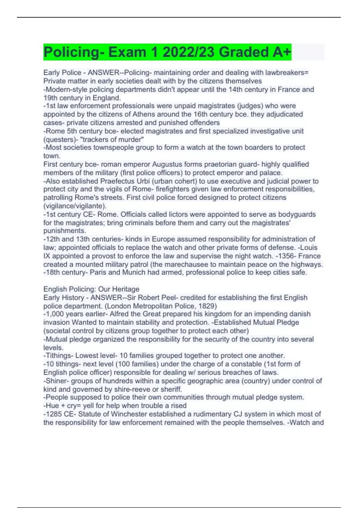 Early Police - ANSWER--Policing- maintaining order and dealing with lawbreakers= Private matter in early societies dealt with by the citizens themselves -Modern-style policing departments didn't appear until the 14th century in France and 19th century in England. -1st law enforcement professionals were unpaid magistrates (judges) who were appointed by the citizens of Athens around the 16th century bce. they adjudicated cases- private citizens arrested and punished offenders -Rome 5th century bce- elected magistrates and first specialized investigative unit (questers)- "trackers of murder" -Most societies townspeople group to form a watch at the town boarders to protect town. First century bce- roman emperor Augustus forms praetorian guard- highly qualified members of the military (first police officers) to protect emperor and palace. -Also established Praefectus Urbi (urban cohert) to use executive and judicial power to protect city and the vigils of Rome- firefighters given law enforcement responsibilities, patrolling Rome's streets. First civil police forced designed to protect citizens (vigilance/vigilante). -1st century CE- Rome. Officials called lictors were appointed to serve as bodyguards for the magistrates; bring criminals before them and carry out the magistrates' punishments. -12th and 13th centuries- kinds in Europe assumed responsibility for administration of law; appointed officials to replace the watch and other private forms of defense. -Louis IX appointed a provost to enforce the law and supervise the night watch. -1356- France created a mounted military patrol (the marechausee to maintain peace on the highways. -18th century- Paris and Munich had armed, professional police to keep cities safe. English Policing: Our Heritage Early History - ANSWER--Sir Robert Peel- credited for establishing the first English police department. (London Metropolitan Police, 1829) -1,000 years earlier- Alfred the Great prepared his kingdom for an impending danish invasion Wanted to maintain stability and protection. -Established Mutual Pledge (societal control by citizens group together to protect each other) -Mutual pledge organized the responsibility for the security of the country into several levels. -Tithings- Lowest level- 10 families grouped together to protect one another. -10 tithings- next level (100 families) under the charge of a constable (1st form of English police officer) responsible for dealing w/ serious breaches of laws. -Shiner- groups of hundreds within a specific geographic area (country) under control of kind and governed by shire-reeve or sheriff. -People supposed to police their own communities through mutual pledge system. -Hue + cry= yell for help when trouble a rised -1285 CE- Statute of Winchester established a rudimentary CJ system in which most of the responsibility for law enforcement remained with the people themselves. -Watch and ward, hue and cry, the parish constable, and requirement