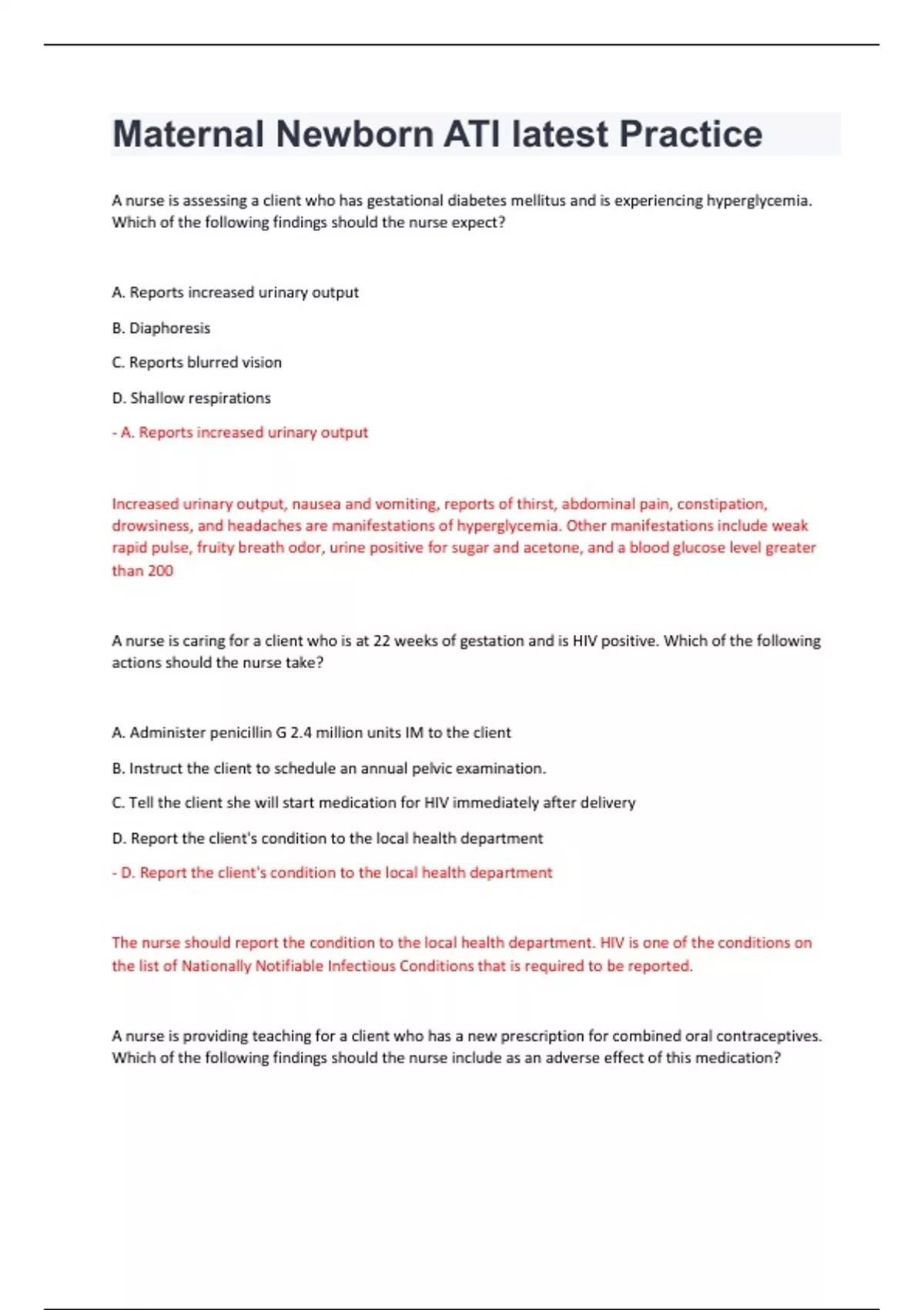 A nurse is assessing a client who has gestational diabetes mellitus and is experiencing hyperglycemia. Which of the following findings should the nurse expect? A. Reports increased urinary output B. Diaphoresis C. Reports blurred vision D. Shallow respirations - A. Reports increased urinary output Increased urinary output, nausea and vomiting, reports of thirst, abdominal pain, constipation, drowsiness, and headaches are manifestations of hyperglycemia. Other manifestations include weak rapid pulse, fruity breath odor, urine positive for sugar and acetone, and a blood glucose level greater than 200 A nurse is caring for a client who is at 22 weeks of gestation and is HIV positive. Which of the following actions should the nurse take? A. Administer penicillin G 2.4 million units IM to the client B. Instruct the client to schedule an annual pelvic examination. C. Tell the client she will start medication for HIV immediately after delivery D. Report the client's condition to the local health department - D. Report the client's condition to the local health department The nurse should report the condition to the local health department. HIV is one of the conditions on the list of Nationally Notifiable Infectious Conditions that is required to be reported. A nurse is providing teaching for a client who has a new prescription for combined oral contraceptives. Which of the following findings should the nurse include as an adverse effect of this medication?A. Depression B. Polyuria C. Hypotension