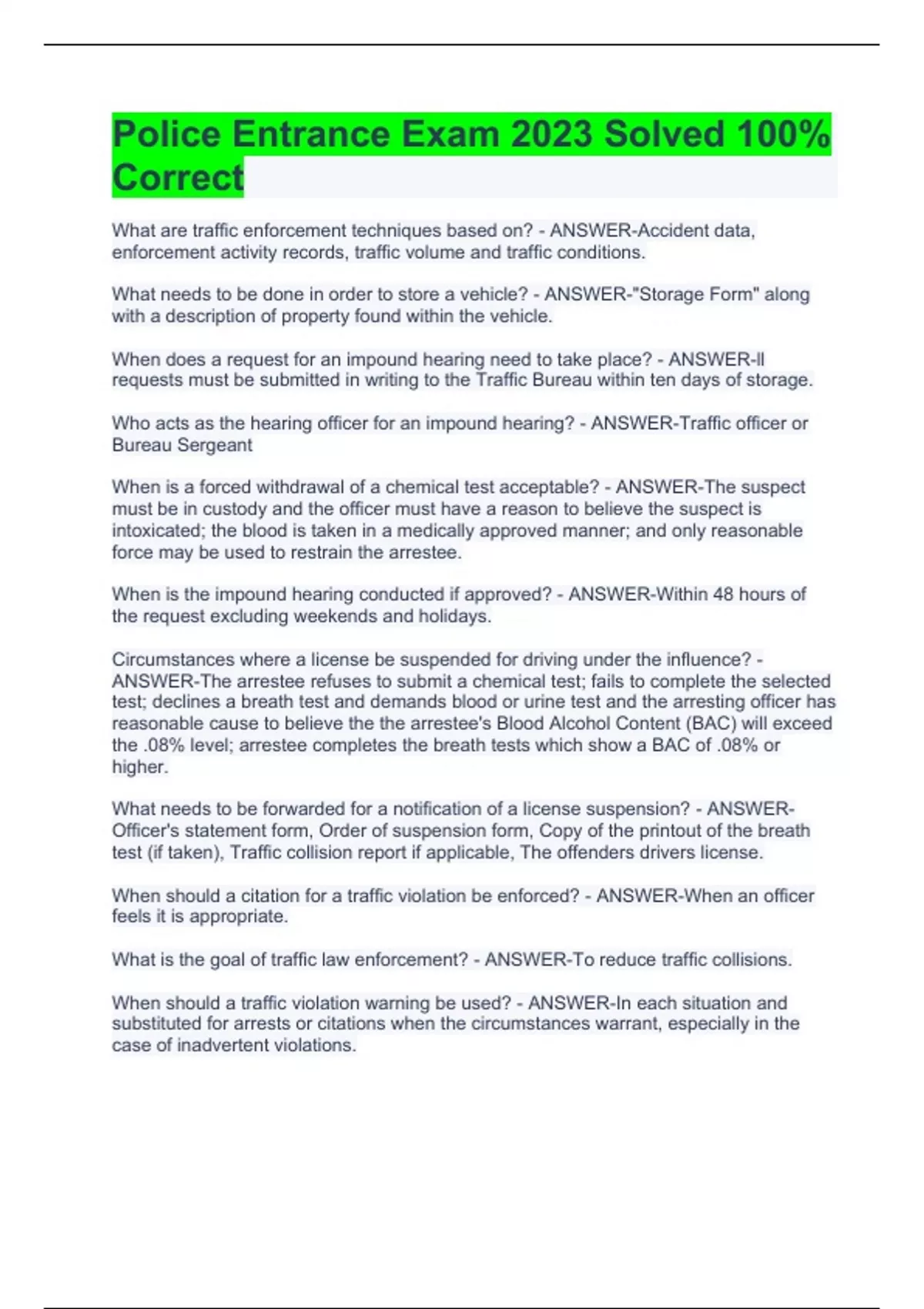 What are traffic enforcement techniques based on? - ANSWER-Accident data, enforcement activity records, traffic volume and traffic conditions. What needs to be done in order to store a vehicle? - ANSWER-"Storage Form" along with a description of property found within the vehicle. When does a request for an impound hearing need to take place? - ANSWER-ll requests must be submitted in writing to the Traffic Bureau within ten days of storage. Who acts as the hearing officer for an impound hearing? - ANSWER-Traffic officer or Bureau Sergeant When is a forced withdrawal of a chemical test acceptable? - ANSWER-The suspect must be in custody and the officer must have a reason to believe the suspect is intoxicated; the blood is taken in a medically approved manner; and only reasonable force may be used to restrain the arrestee. When is the impound hearing conducted if approved? - ANSWER-Within 48 hours of the request excluding weekends and holidays. Circumstances where a license be suspended for driving under the influence? - ANSWER-The arrestee refuses to submit a chemical test; fails to complete the selected test; declines a breath test and demands blood or urine test and the arresting officer has reasonable cause to believe the the arrestee's Blood Alcohol Content (BAC) will exceed the .08% level; arrestee completes the breath tests which show a BAC of .08% or higher. What needs to be forwarded for a notification of a license suspension? - ANSWER-Officer's statement form, Order of suspension form, Copy of the printout of the breath test (if taken), Traffic collision report if applicable, The offenders drivers license. When should a citation for a traffic violation be enforced? - ANSWER-When an officer feels it is appropriate. What is the goal of traffic law enforcement? - ANSWER-To reduce traffic collisions. When should a traffic violation warning be used? - ANSWER-In each situation and substituted for arrests or citations when the circumstances warrant, especially in the case of inadvertent violations.