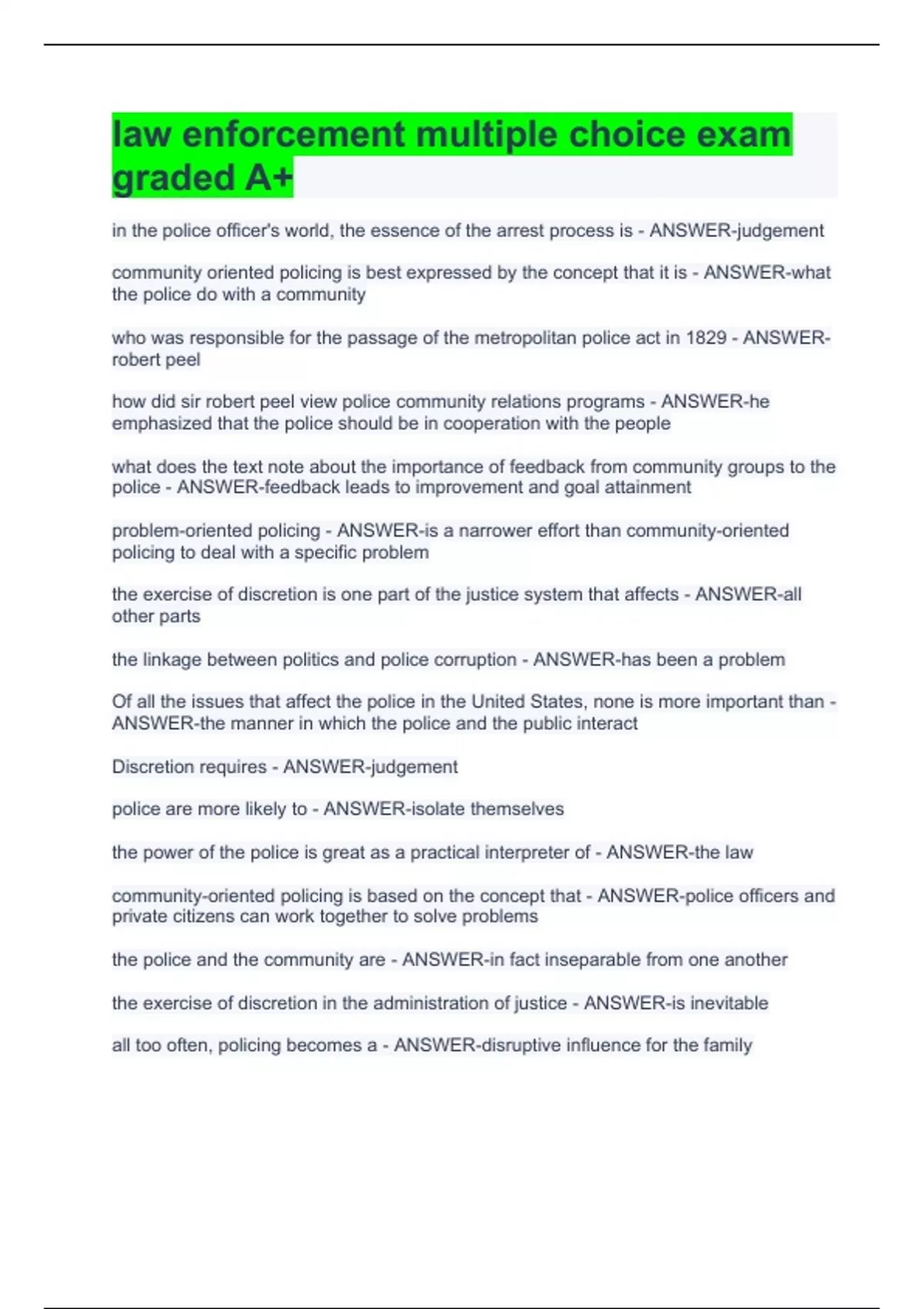 in the police officer's world, the essence of the arrest process is - ANSWER-judgement community oriented policing is best expressed by the concept that it is - ANSWER-what the police do with a community who was responsible for the passage of the metropolitan police act in 1829 - ANSWER-robert peel how did sir robert peel view police community relations programs - ANSWER-he emphasized that the police should be in cooperation with the people what does the text note about the importance of feedback from community groups to the police - ANSWER-feedback leads to improvement and goal attainment problem-oriented policing - ANSWER-is a narrower effort than community-oriented policing to deal with a specific problem the exercise of discretion is one part of the justice system that affects - ANSWER-all other parts the linkage between politics and police corruption - ANSWER-has been a problem Of all the issues that affect the police in the United States, none is more important than - ANSWER-the manner in which the police and the public interact Discretion requires - ANSWER-judgement police are more likely to - ANSWER-isolate themselves the power of the police is great as a practical interpreter of - ANSWER-the law community-oriented policing is based on the concept that - ANSWER-police officers and private citizens can work together to solve problems the police and the community are - ANSWER-in fact inseparable from one another the exercise of discretion in the administration of justice - ANSWER-is inevitable all too often, policing becomes a - ANSWER-disruptive influence for the family