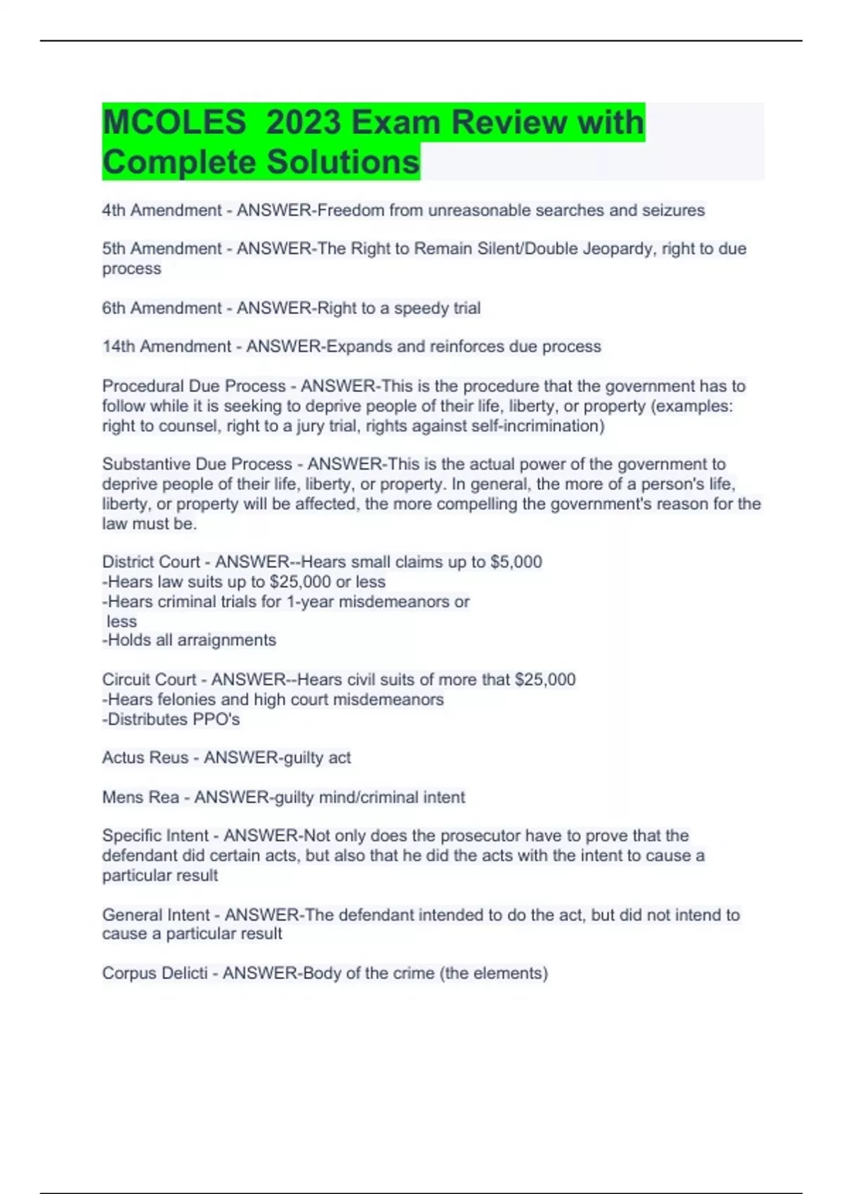 4th Amendment - ANSWER-Freedom from unreasonable searches and seizures 5th Amendment - ANSWER-The Right to Remain Silent/Double Jeopardy, right to due process 6th Amendment - ANSWER-Right to a speedy trial 14th Amendment - ANSWER-Expands and reinforces due process Procedural Due Process - ANSWER-This is the procedure that the government has to follow while it is seeking to deprive people of their life, liberty, or property (examples: right to counsel, right to a jury trial, rights against self-incrimination) Substantive Due Process - ANSWER-This is the actual power of the government to deprive people of their life, liberty, or property. In general, the more of a person's life, liberty, or property will be affected, the more compelling the government's reason for the law must be. District Court - ANSWER--Hears small claims up to $5,000 -Hears law suits up to $25,000 or less -Hears criminal trials for 1-year misdemeanors or less -Holds all arraignments Circuit Court - ANSWER--Hears civil suits of more that $25,000 -Hears felonies and high court misdemeanors -Distributes PPO's Actus Reus - ANSWER-guilty act Mens Rea - ANSWER-guilty mind/criminal intent Specific Intent - ANSWER-Not only does the prosecutor have to prove that the defendant did certain acts, but also that he did the acts with the intent to cause a particular result General Intent - ANSWER-The defendant intended to do the act, but did not intend to cause a particular result Corpus Delicti - ANSWER-Body of the crime (the elements)