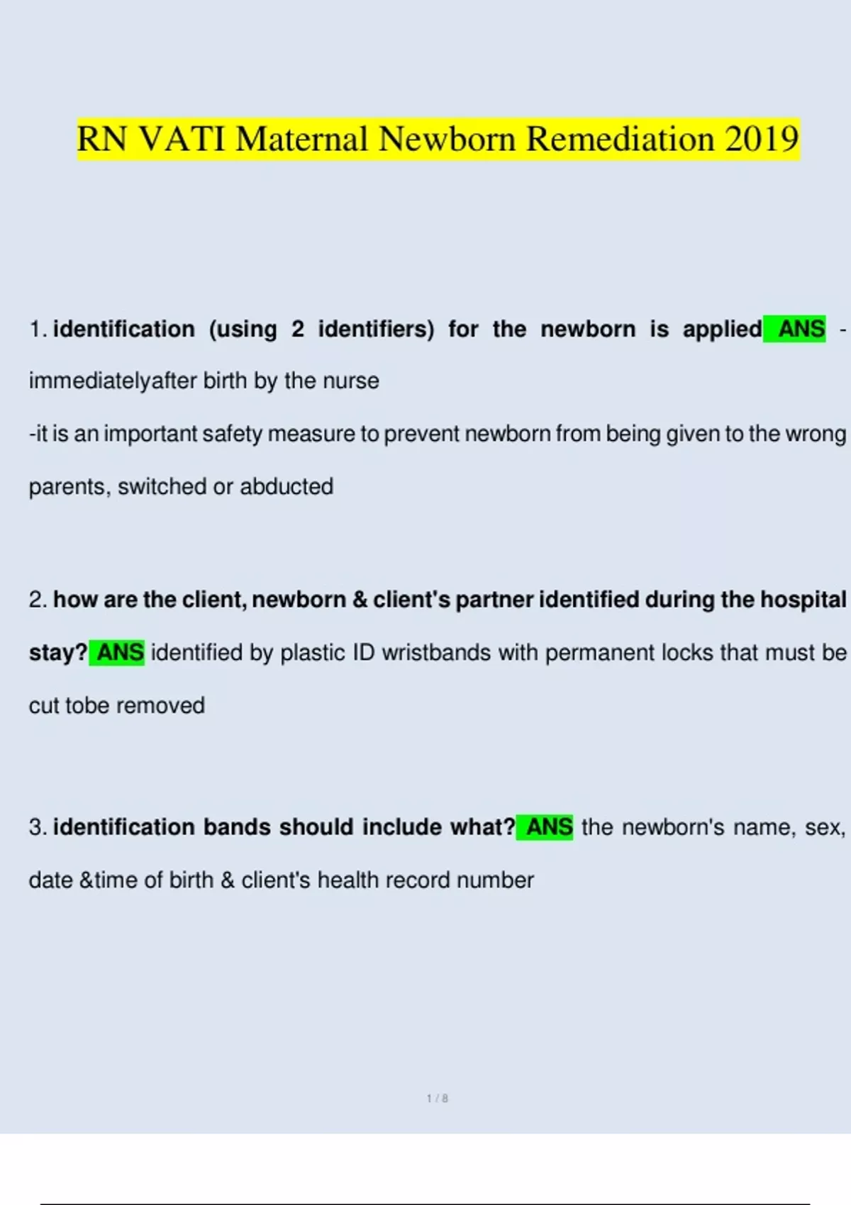 3. identification bands should include what? ANS the newborn's name, sex,
