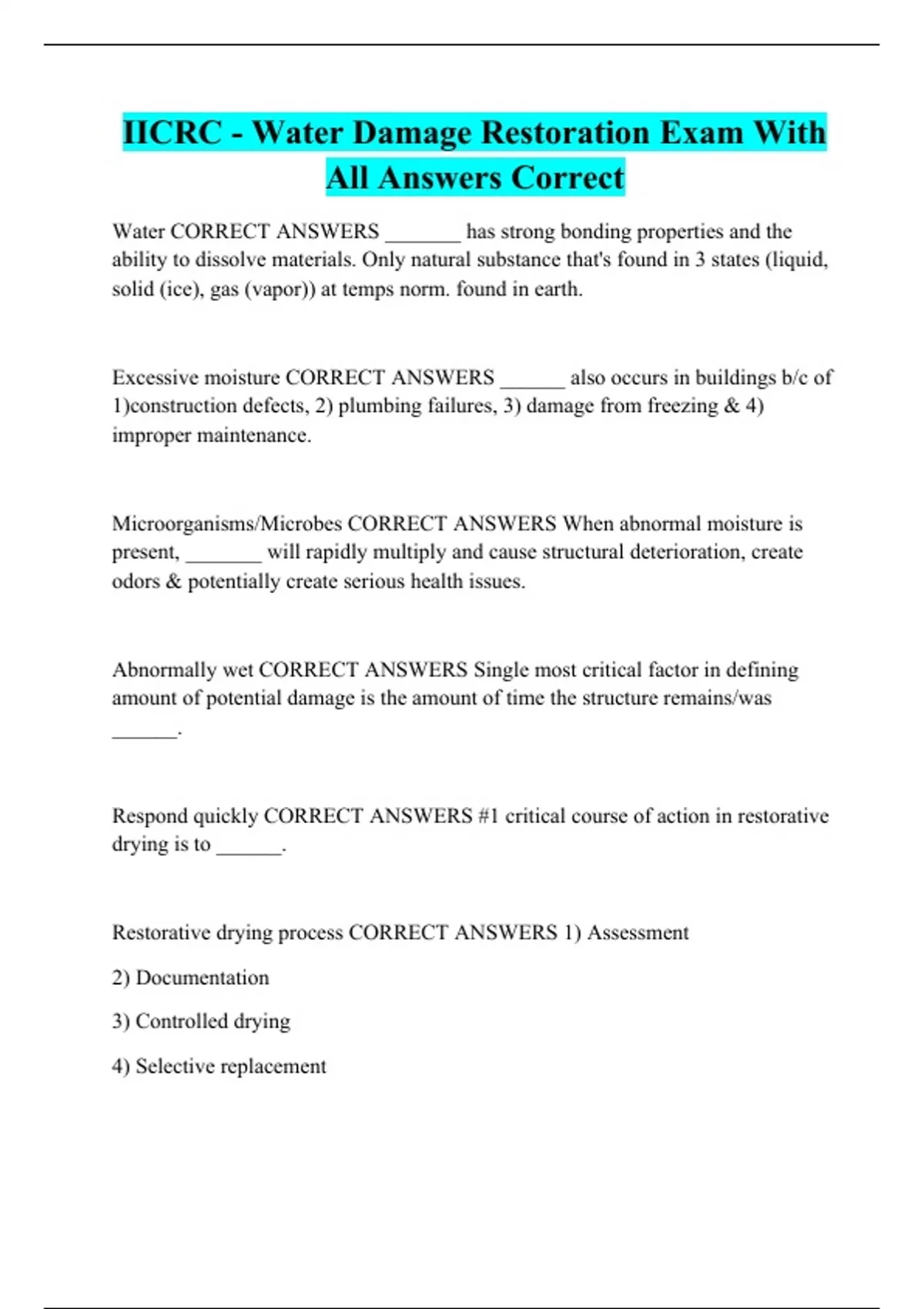 IICRC - Water Damage Restoration Exam With All Answers Correct