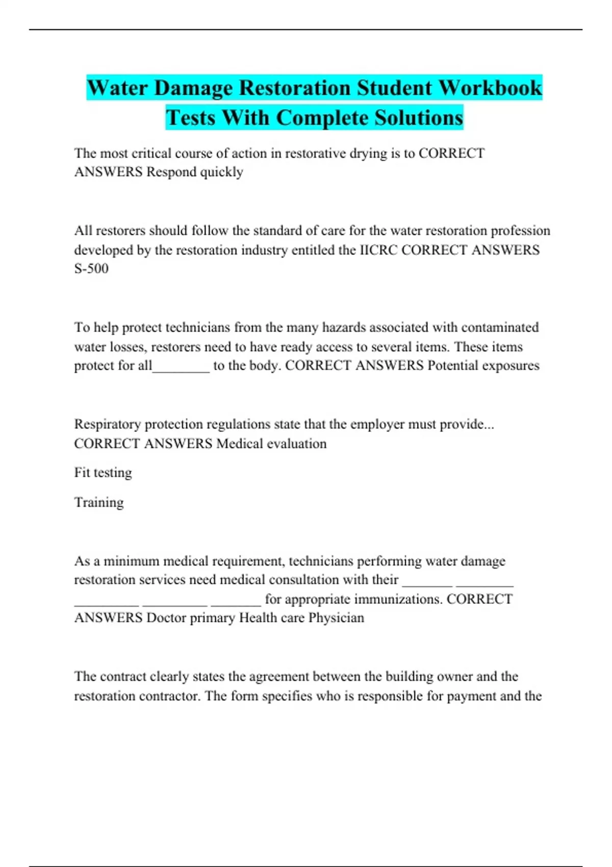 Water Damage Restoration Student Workbook Tests With Complete Solutions