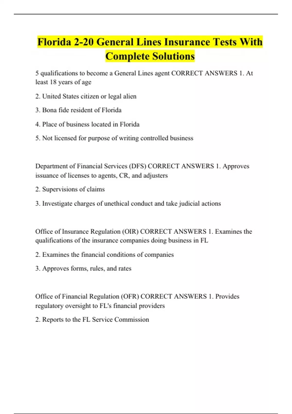 Florida 2-20 General Lines Insurance Tests With Complete Solutions
