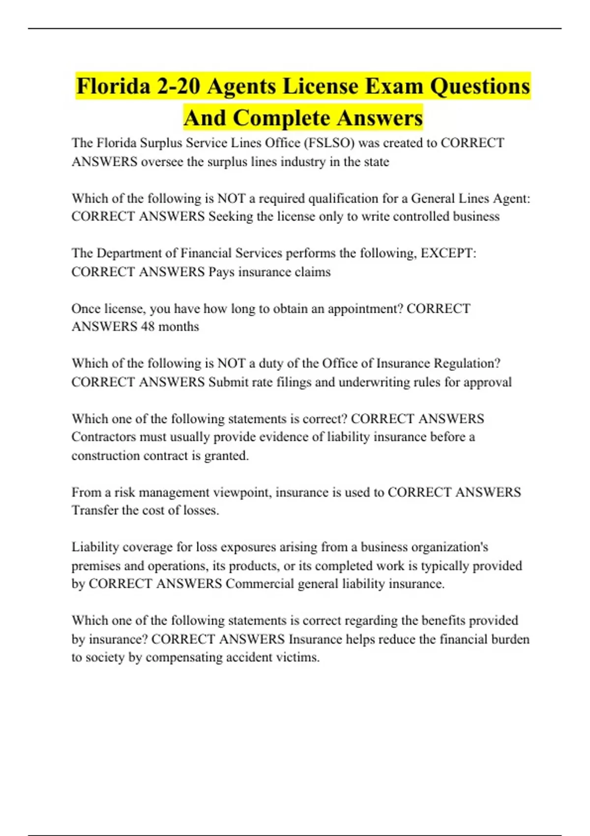 Florida 2-20 Agents License Exam Questions And Complete Answers