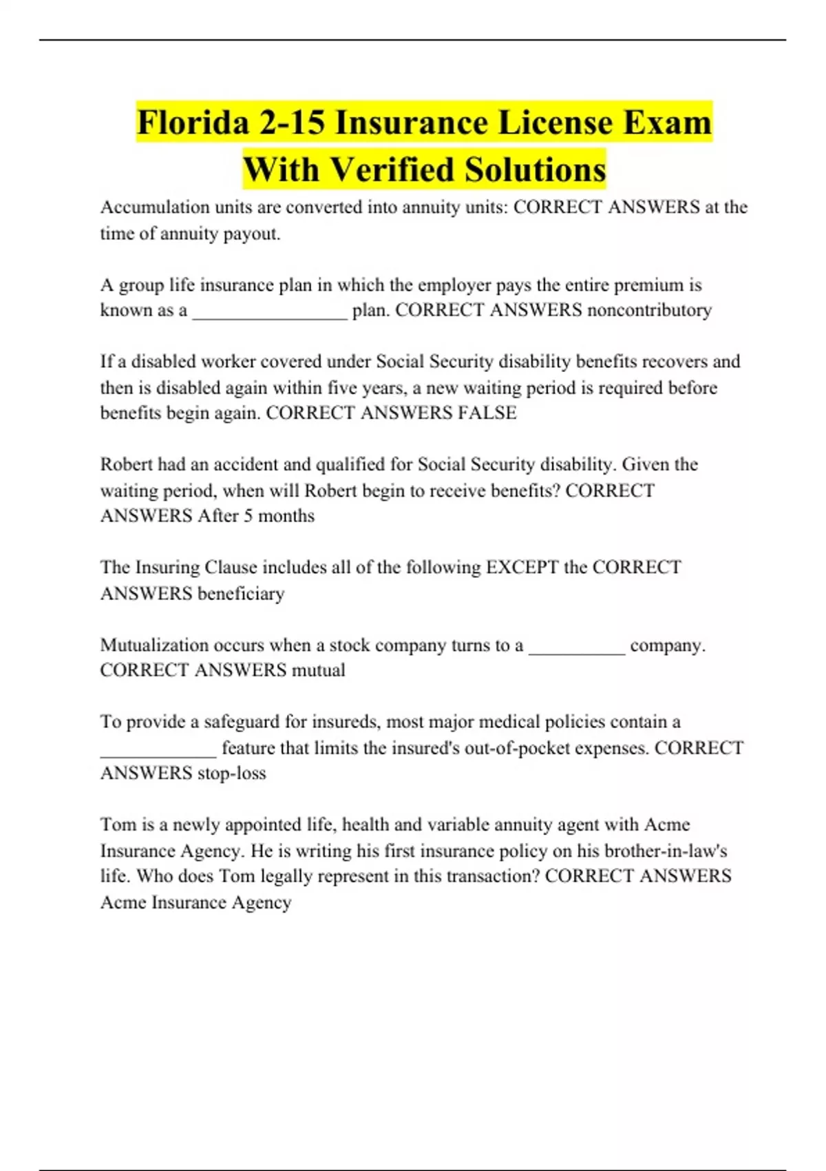 Florida 2-15 Insurance License Exam With Verified Solutions