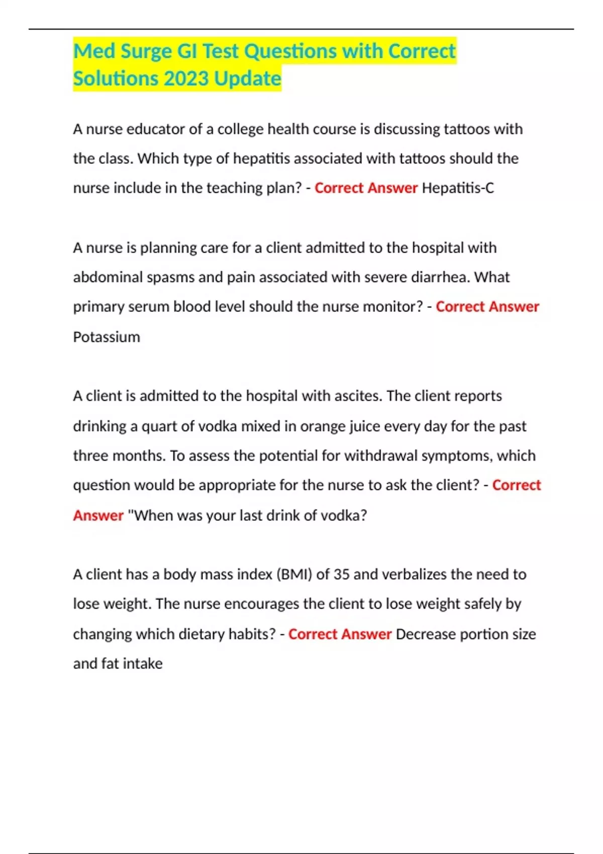 Med Surge GI Test Questions with Correct Solutions 2023 Update