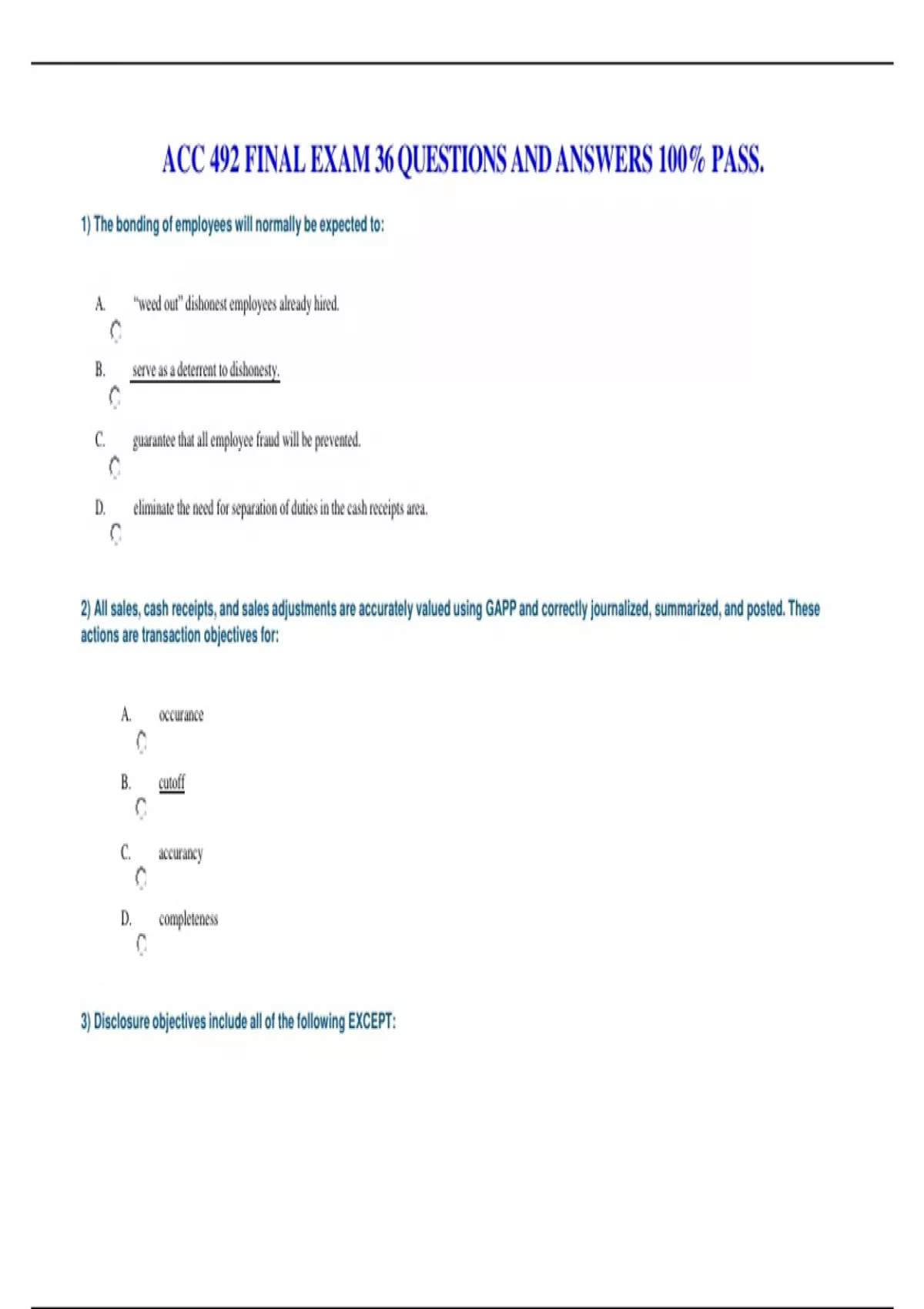 1) The bonding of employees will normally be expected to: A. “weed out” dishonest employees already hired. B. serve as a deterrent to dishonesty. C. guarantee that all employee fraud will be prevented. D. eliminate the need for separation of duties in the cash receipts area. 2) All sales, cash receipts, and sales adjustments are accurately valued using GAPP and correctly journalized, summarized, and posted. These actions are transaction objectives for: A. occurance B. cutoff C. accurancy D. completeness 3) Disclosure objectives include all of the following EXCEPT: A. occurrence and rights and obligations B. classification and understandability C. completeness D. cutoff 4) The extent of the auditor’s inventory test count would LEAST depend on which of the following? A. The nature and composition of the inventory. B. The existence of inventory at multiple locations. C. The effectiveness of controls pertaining to maintenance of perpetual records. D. The care exercised by client employees in taking the inventory. 5) When statistical sampling methods are used by the client in determining inventories, professional standards require that the auditor ascertain the following EXCEPT that the: A. sampling plan has statistical validity. B. appropriate tests of transactions have been applied. C. results in terms of reliability are reasonable. D. sampling plan has been properly applied