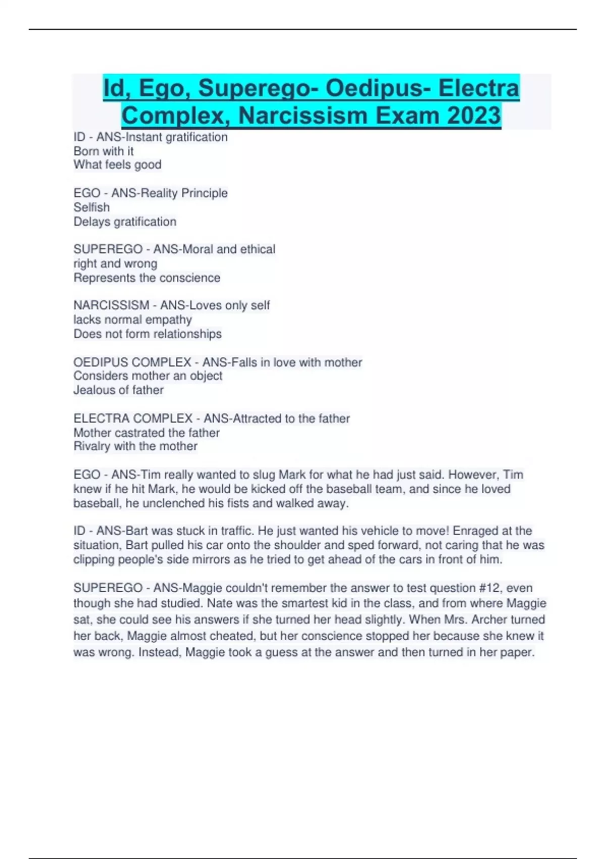Id, Ego, Superego- Oedipus- Electra Complex, Narcissism Exam 2023
