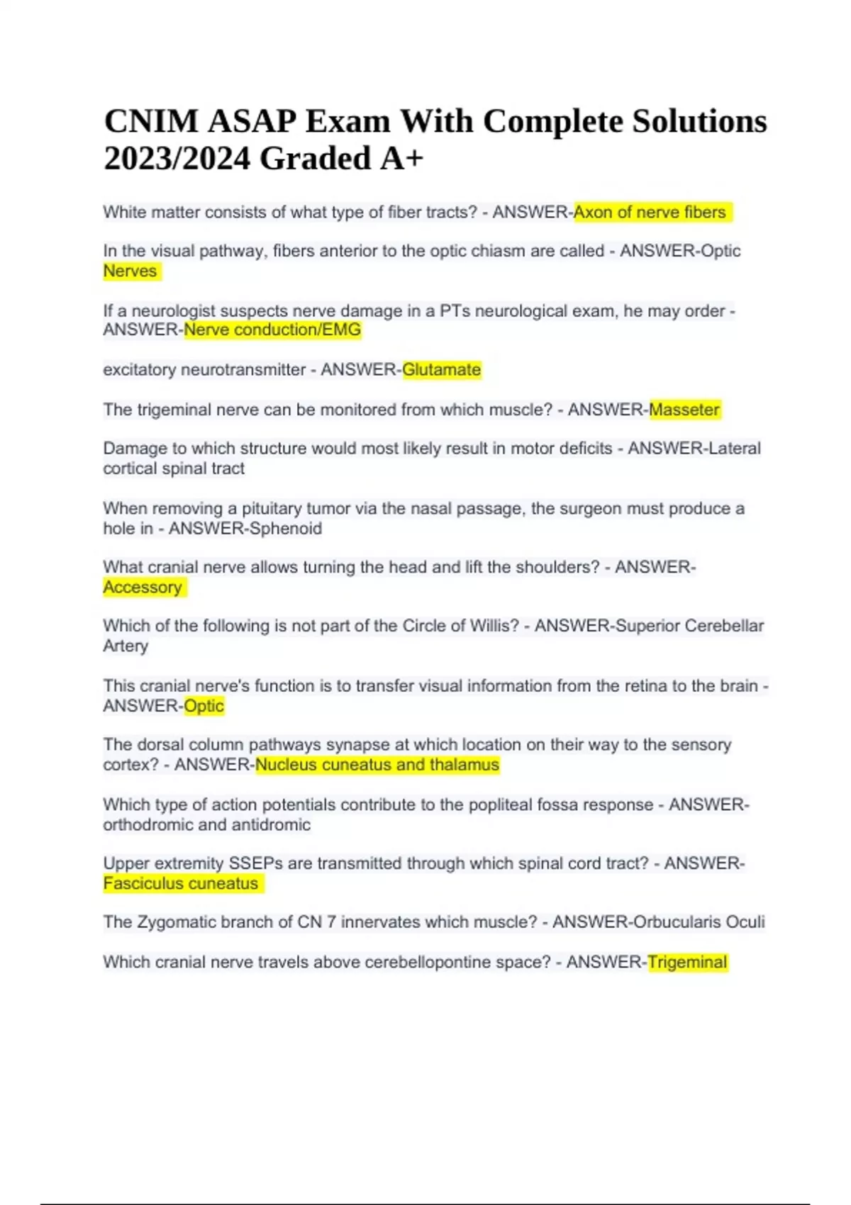 CNIM ASAP Exam With Complete Solutions 2023/2024 Graded A+. White matter consists of what type of fiber tracts? - ANSWER-Axon of nerve fibers In the visual pathway, fibers anterior to the optic chiasm are called - ANSWER-Optic Nerves If a neurologist suspects nerve damage in a PTs neurological exam, he may order - ANSWER-Nerve conduction/EMG excitatory neurotransmitter - ANSWER-Glutamate The trigeminal nerve can be monitored from which muscle? - ANSWER-Masseter Damage to which structure would most likely result in motor deficits - ANSWER-Lateral cortical spinal tract When removing a pituitary tumor via the nasal passage, the surgeon must produce a hole in - ANSWER-Sphenoid What cranial nerve allows turning the head and lift the shoulders? - ANSWERAccessory Which of the following is not part of the Circle of Willis? - ANSWER-Superior Cerebellar Artery This cranial nerve's function is to transfer visual information from the retina to the brain - ANSWER-Optic The dorsal column pathways synapse at which location on their way to the sensory cortex? - ANSWER-Nucleus cuneatus and thalamus Which type of action potentials contribute to the popliteal fossa response - ANSWERorthodromic and antidromic Upper extremity SSEPs are transmitted through which spinal cord tract? - ANSWERFasciculus cuneatus The Zygomatic branch of CN 7 innervates which muscle? - ANSWER-Orbucularis Oculi Which cranial nerve travels above cerebellopontine space? - ANSWER-Trigeminal CNIM ASAP Exam With Complete Solutions 2023/2024 Graded A+ What type of glial cells make up the myelin sheath of the peripheral nervous system? - ANSWER-Schwann ions are involved in a neuronal action potential - ANSWER-Potassium and Sodium The Artery of Adamkiewicz originates between: - ANSWER-T8-L1 resting membrane potential of a neuron - ANSWER--70mV What type of glial cells make up the myelin sheath of the central nervous system - ANSWER-Oligidendrocytes C7 nerve route emerges from the inter-vertebral foramen between - ANSWER-C6 and C7 vertebrae C8 nerve root exits the spinal cord - ANSWER-Above T1 The anterior spinothalamic tract carries sensory modalities of - ANSWER-Crude touch During a CEA, collateral perfusion is maintained by - ANSWER-Circle of Willis The blood supply to the spinal cord is predominantly provided by - ANSWER-ASA The two vertebral arteries pass through foramen magnum and unite to form - ANSWERThe basilar artery not one of the branches of the facial nerve - ANSWER-maxillary What is the segmental motor innervation of the peroneus longus? - ANSWER-L4, L5, S1 Where is the central relay station for sensory information that is located between the cerebrum and spinal cord? - ANSWER-Thalamus Upper extremity SSEPs are primarily transmitted through - ANSWER-Fasciculus Cuneatus Conus medullaris is located at which level in adults? - ANSWER-L1 and L2 The thalamus and hypothalamus make up the - ANSWER-Diencephalon Cranial Nerve 6 - ANSWER-Abducens Resection of skull base tumors in the cerebellopontine angle may reduce the blood flow to which of the following vessels? - ANSWER-AICA .