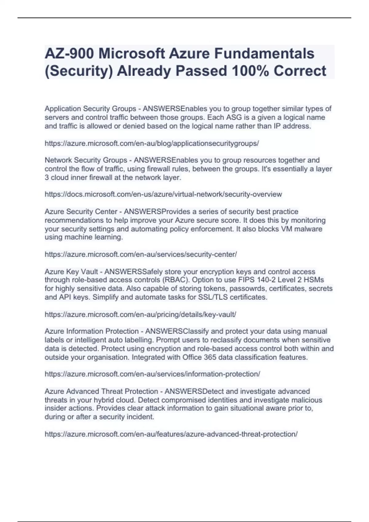 AZ-900 Microsoft Azure Fundamentals (Security) Already Passed 100% Correct