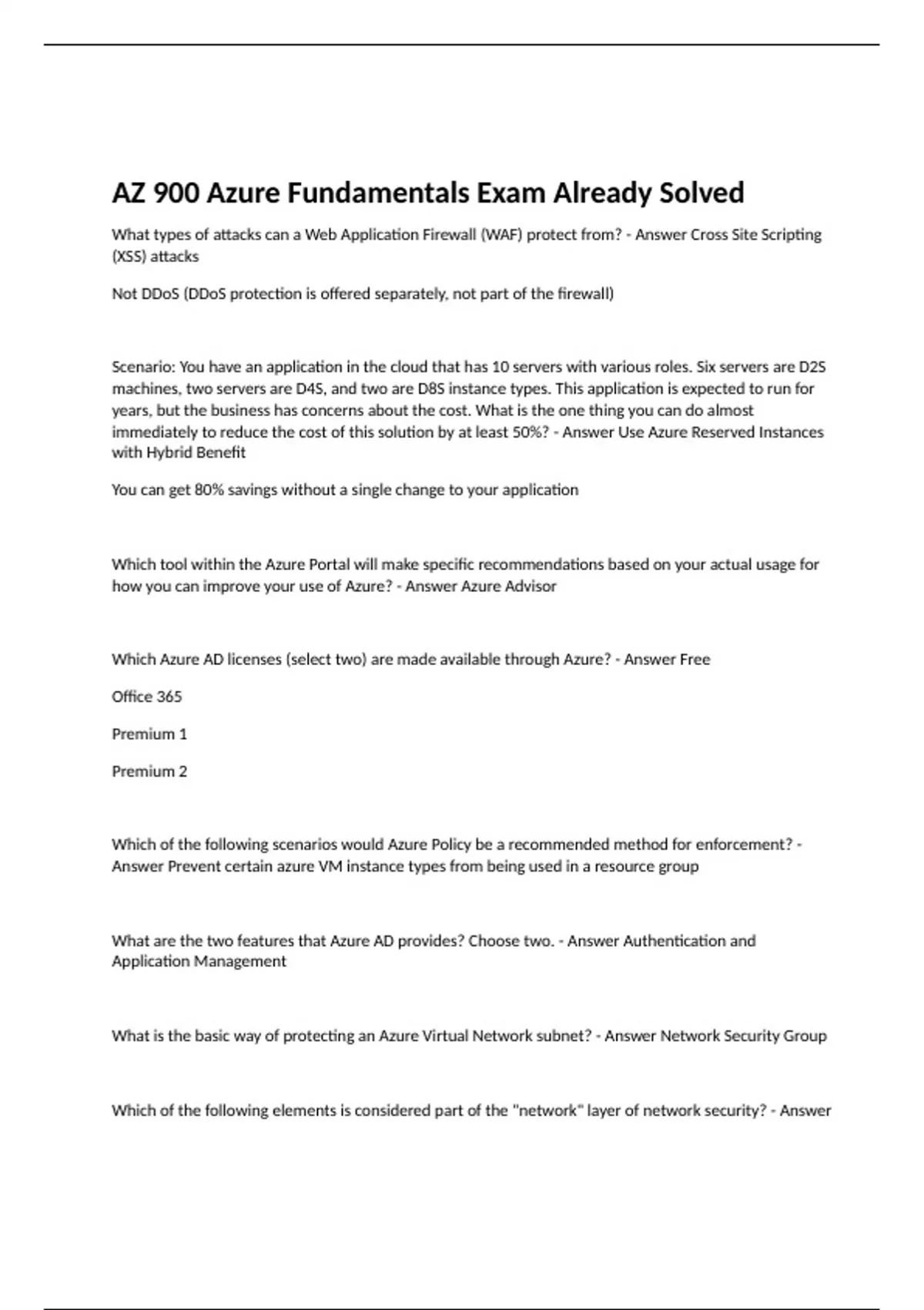 What types of attacks can a Web Application Firewall (WAF) protect from? - Answer Cross Site Scripting (XSS) attacks Not DDoS (DDoS protection is offered separately, not part of the firewall) Scenario: You have an application in the cloud that has 10 servers with various roles. Six servers are D2S machines, two servers are D4S, and two are D8S instance types. This application is expected to run for years, but the business has concerns about the cost. What is the one thing you can do almost immediately to reduce the cost of this solution by at least 50%? - Answer Use Azure Reserved Instances with Hybrid Benefit You can get 80% savings without a single change to your application Which tool within the Azure Portal will make specific recommendations based on your actual usage for how you can improve your use of Azure? - Answer Azure Advisor Which Azure AD licenses (select two) are made available through Azure? - Answer Free Office 365 Premium 1 Premium 2 Which of the following scenarios would Azure Policy be a recommended method for enforcement? - Answer Prevent certain azure VM instance types from being used in a resource group What are the two features that Azure AD provides? Choose two. - Answer Authentication and Application Management What is the basic way of protecting an Azure Virtual Network subnet? - Answer Network Security Group Which of the following elements is considered part of the "network" layer of network security? - Answer Separate servers into distinct subnets by role Which feature within Azure collects all of the logs from various resources into a central dashboard, where you can run queries, view graphs, and create alerts on certain events? - Answer Azure Monitor Azure Advisor - Answer a tool that will analyze your use of Azure and make you specific recommendations based on your usage across availability, security, performance and cost categories Azure Service Health - Answer feature that alerts you to service issues that happen in Azure itself, not specifically related to your own resources Azure Policy - Answer a service to create policies the policies allow you to enforce and control the properties of a resource can add restrictions on storage account SKUs, virtual machine instance types, and rules relating to tagging of resources and groups, it cannot prompt a user to ask them if they are sure Network Security Group (NSG) - Answer **a virtual firewall at the subnet level a virtual firewall for subnets instead of vnets a fairly basic set of rules that you can apply to both inbound traffic and outbound traffic that lets you specify what sources, destinations and ports are allowed to travel through from outside the virtual network to inside the virtual network Azure Monitor - Answer a centralized dashboard that collects all the logs, metrics and events from your resources for telemetry An IT needs to create a VM in Azure. Currently, the IT Engineer has an Android OS based workstation. Which of the following can the IT Engineer use to create the desired VM in Azure Microsoft PowerApps Azure Cloud Shell Azure Powershell Azure CLI - Answer Azure Cloud Shell Azure Powershell Azure CLI Microsoft PowerApps - Answer is not used to create VMs it allows you to build mobile apps from selectable templates Does the Azure Free Account allow you to host production-based resources? - Answer Yes Does Azure AD have capabilities to implement authorization using Azure RBAC to secure resources? - Answer Yes Does the Azure AD Premium P2 tier come with an SLA of 99.9%? - Answer Yes A company needs to store 2 TB worth of data this is infrequently used. The data needs to be accessed via PowerBI. Which of the following could be used as a cost-effective data layer for this requirement? - Answer Azure Data Lake A company needs to create around 50 customized VMs. 20 are windows base and 30 are Ubuntu. Which of the following would help reduce the administrative effort required to deploy the machines? - Answer Azure Scale Sets A company want to use Azure for the deployment of various solutions. They want to ensure that whenever users authenticate to Azure, they have to make use of MFA. Which can help them achieve this? - Answer Azure Privileged Identity Management When a VM is stopped, will you still incur costs for the storage attached to the VM? - Answer Yes Azure Powershell - Answer powershell is a task automation and configuration management framework *a commands line shell and scripting language PowerShell 5.1 on Windows and PowerShell 7.x and higher on all platforms Cloud Shell - Answer interactive, authenticated, browser accessible shell for managing azure resources allows access to the CLI and Powershell consoles in the Azure Portal you access from the azure portal you can use either bash or powershell A tool that provides guidance and recommendations to improve an Azure environment - Answer Azure Advisor A tool used to monitor Web applications hosted in production-based environments - Answer Azure Applications Insights What data solution would you consider for these requirements? - no need for schema or index management - ensure low latency access to data from around the world - Answer Azure Cosmos DB A company is planning to deploy Azure resources to a resource group. The company is planning to assign tags to the resource groups. Would the resources in the resource group also inherit the same tags? - Answer No Would the Azure Advisor tool alone be able to give recommendations on how to improve the security of the Azure AD environment? - Answer No Which of the following could be used to automate the deployment of 10 Azure resources for several departments using infrastructure as code? - Answer Azure Resource Manager templates A company has hosted its solutions on the Azure Cloud. They need to implement MFA for identities hosted in Azure. It is necessary to deploy a federation solution or sync on-premise identities to the cloud? - Answer No Using Azure AD, they have the requirement that they