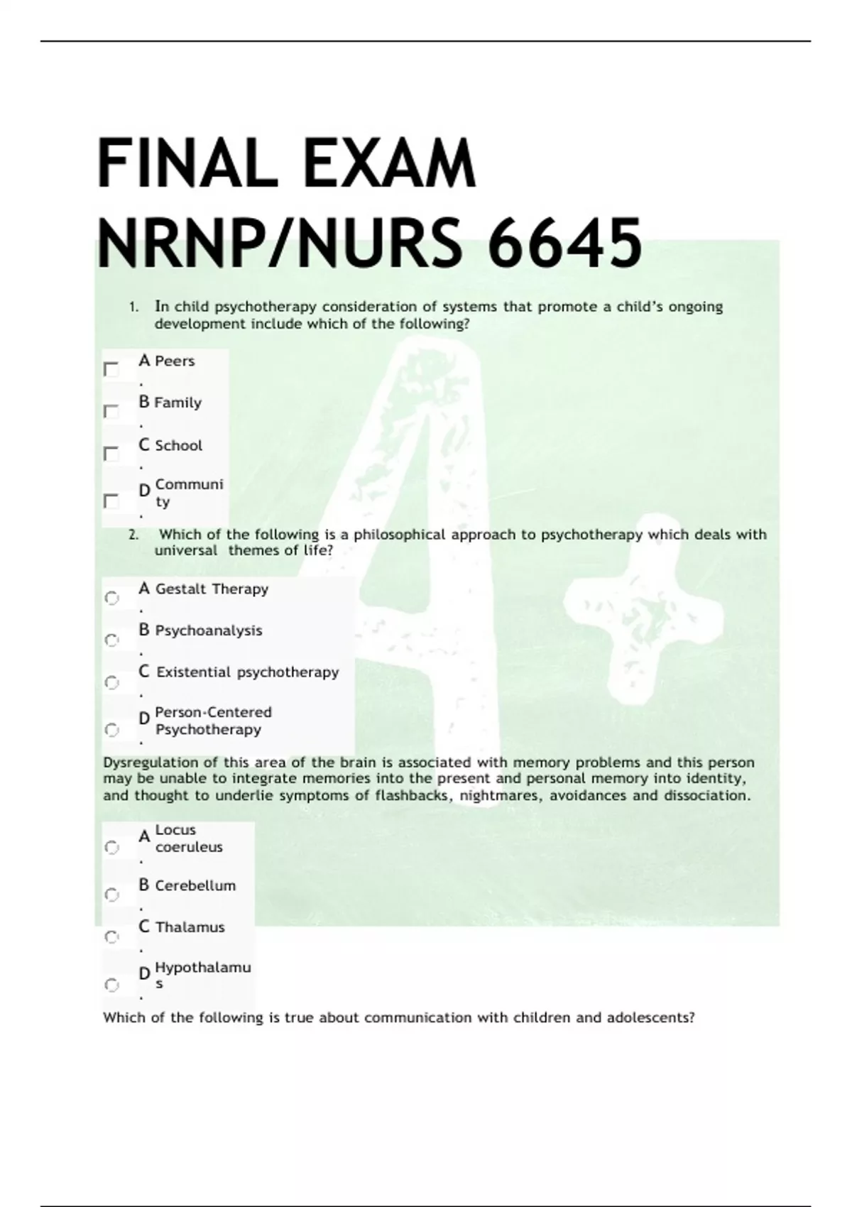 FINAL EXAM NRNP/NURS 6645 1. In child psychotherapy consideration of systems that promote a child’s ongoing development include which of the following? 2. Which of the following is a philosophical approach to psychotherapy which deals with universal themes of life? Dysregulation of this area of the brain is associated with memory problems and this person may be unable to integrate memories into the present and personal memory into identity, and thought to underlie symptoms of flashbacks, nightmares, avoidances and dissociation. Which of the following is true about communication with