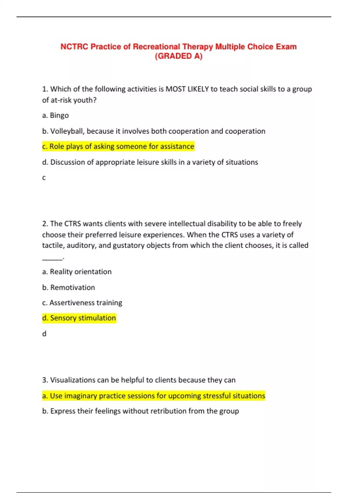 NCTRC Practice of Recreational Therapy Multiple Choice Exam (GRADED A)