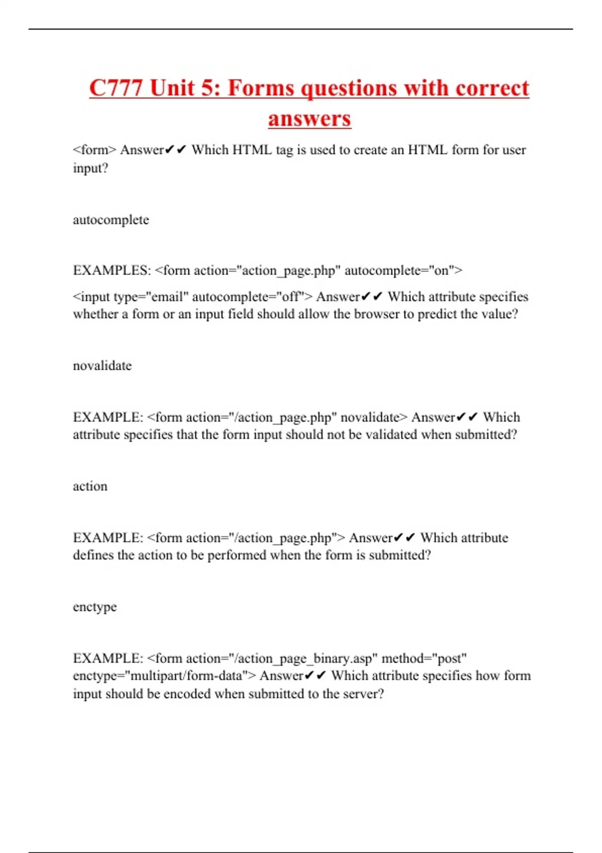 <form> Answer Which HTML tag is used to create an HTML form for user input? autocomplete EXAMPLES: <form action="action_" autocomplete="on"> <input type="email" autocomplete="off"> Answer Which attribute specifies whether a form or an input field should allow the browser to predict the value? novalidate EXAMPLE: <form action="/action_" novalidate> Answer Which attribute specifies that the form input should not be validated when submitted? action EXAMPLE: <form action="/action_"> Answer Which attribute defines the action to be performed when the form is submitted? enctype EXAMPLE: <form action="/action_page_" method="post" enctype="multipart/form-data"> Answer Which attribute specifies how form input should be encoded when submitted to the server?