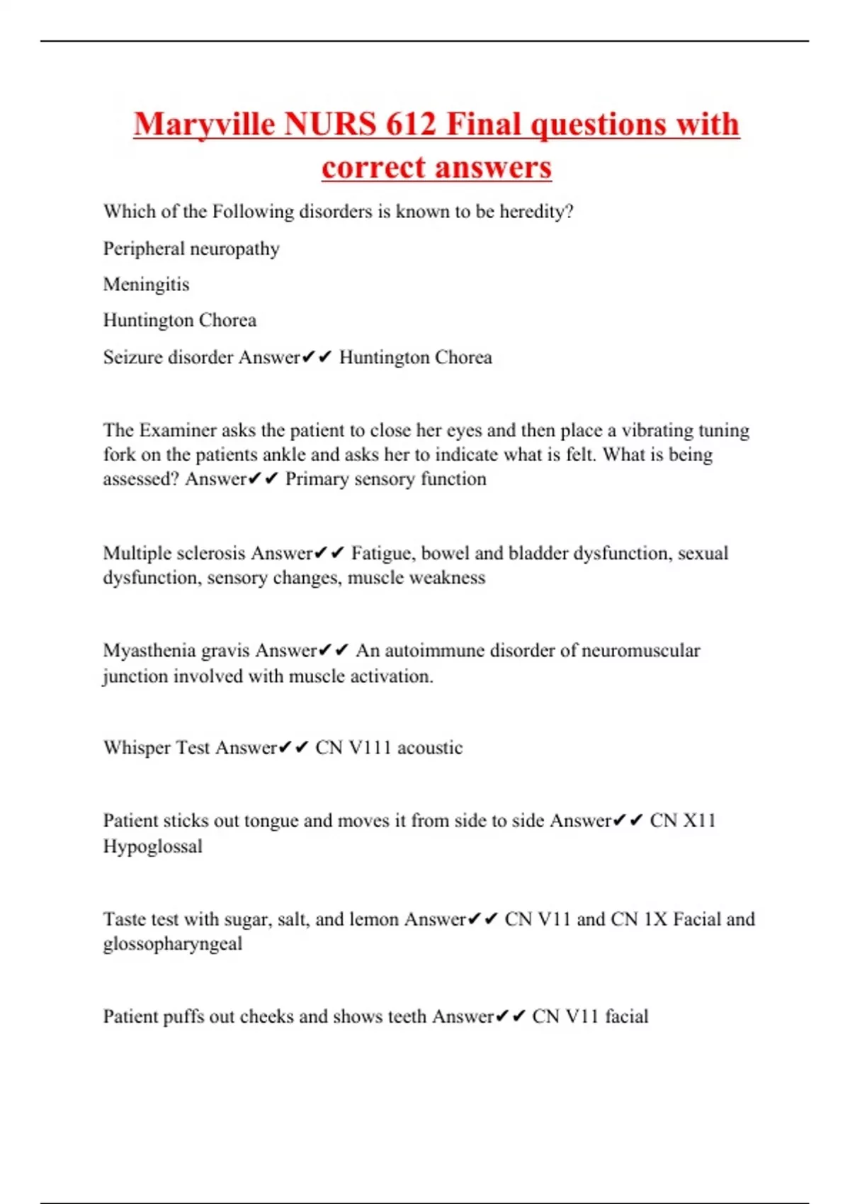 Which of the Following disorders is known to be heredity? Peripheral neuropathy Meningitis Huntington Chorea Seizure disorder Answer Huntington Chorea The Examiner asks the patient to close her eyes and then place a vibrating tuning fork on the patients ankle and asks her to indicate what is felt. What is being assessed? Answer Primary sensory function Multiple sclerosis Answer Fatigue, bowel and bladder dysfunction, sexual dysfunction, sensory changes, muscle weakness Myasthenia gravis Answer An autoimmune disorder of neuromuscular junction involved with muscle activation. Whisper Test Answer CN V111 acoustic Patient sticks out tongue and moves it from side to side Answer CN X11 Hypoglossal Taste test with sugar, salt, and lemon Answer CN V11 and CN 1X Facial and glossopharyngeal