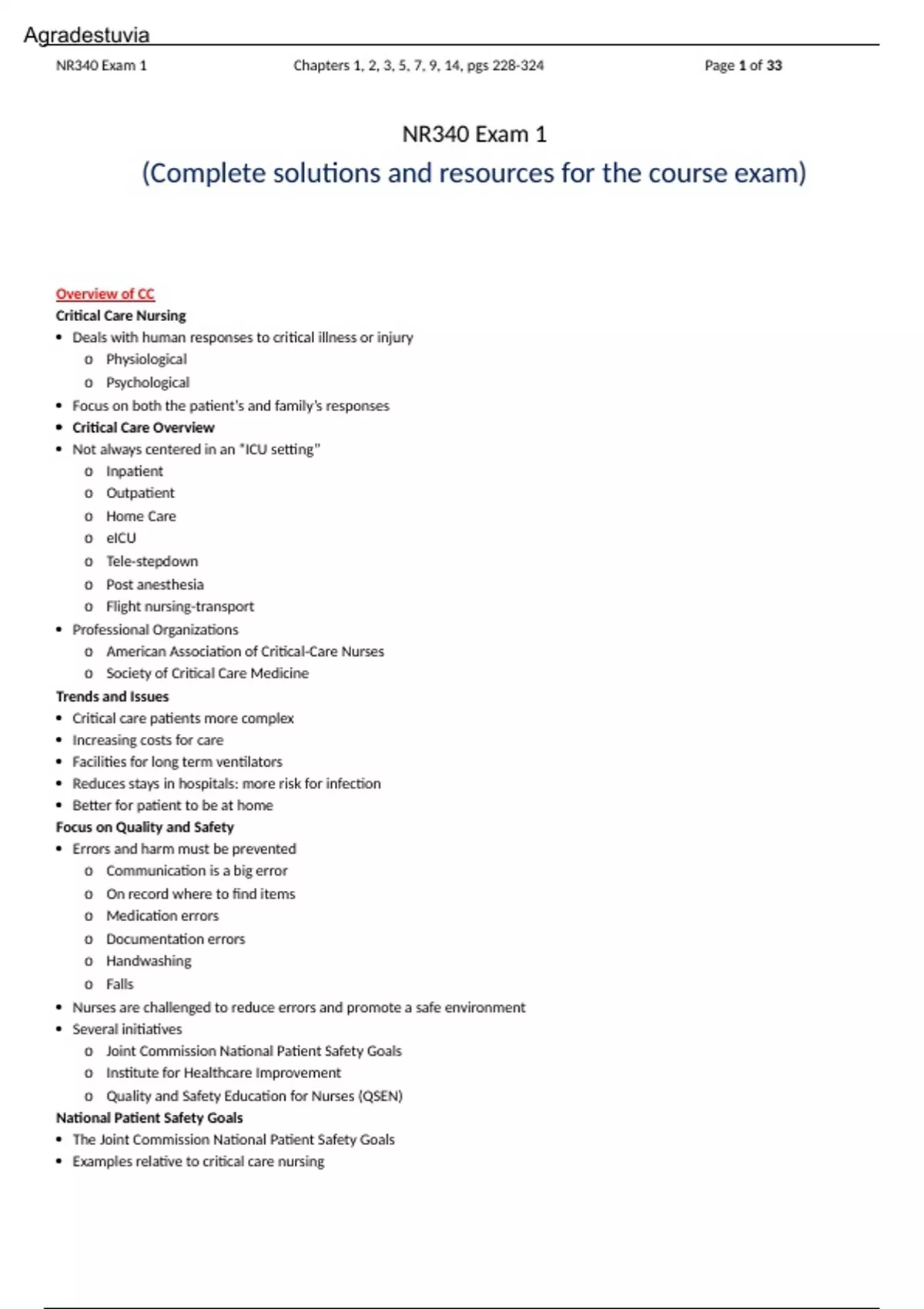 NR340 Exam 1 (Complete solutions and resources for the course examOverview of CC Critical Care Nursing  Deals with human responses to critical illness or injury o Physiological o Psychological  Focus on both the patient’s and family’s responses  Critical Care Overview  Not always centered in an “ICU setting” o Inpatient o Outpatient o Home Care o eICU o Tele-stepdown o Post anesthesia o Flight nursing-transport  Professional Organizations o American Association of Critical-Care Nurses o Society of Critical Care Medicine Trends and Issues  Critical care patients more complex  Increasing costs for care  Facilities for long term ventilators  Reduces stays in hospitals: more risk for infection  Better for patient to be at home Focus on Quality and Safety  Errors and harm must be prevented o Communication is a big error o On record where to find items o Medication errors o Documentation errors o Handwashing o Falls  Nurses are challenged to reduce errors and promote a safe environment  Several initiatives o Joint Commission National Patient Safety Goals o Institute for Healthcare Improvement o Quality and Safety Education for Nurses (QSEN) National Patient Safety Goals  The Joint Commission National Patient Safety Goals  Examples relative to critical care nursing Agradestuvia NR340 Exam 1 Chapters 1, 2, 3, 5, 7, 9, 14, pgs 228-324 Page 2 of 33 o Communication o Medication safety o Reduce infections o Reconcile medications o Telephone orders- SAY BACK o TALL letters for similar drug names Harms Targeted for Reduction  Adverse drug events  Infections o Catheter-associated urinary tract infections (CAUTI) o Central line–associated bloodstream infections (CLABSI) o Surgical site infections o Ventilator-associated pneumonia (VAP)  Injuries from falls and immobility  Obstetric adverse events  Pressure ulcers  Venous thromboembolism (VTE) Communication  Communication important for safe care  Standardized approaches o SBAR and SBAP  Situation  Background  Assessment  Recommendation (Plan)  Collaboration o Nurse/ doctor o Debreifing Other Trends and Issues  Reducing hospital readmission rates o Chronic illness (HF)  Increasing use of technology o Electronic medical records o Physician order entry  Ethical issues associated with prolonging life and futile treatment  Telemedicine and eICU  Aging population and workforce  Shortage of CC nurses The Critical Care Environment  Stressful  Noisy  Sleep Deprivation  Concerns of the Critically Ill Patient o Patients responses do vary  Loss of control (even breathing)  ↓ Communication (d/t vent) Agradestuvia NR340 Exam 1 Chapters 1, 2, 3, 5, 7, 9, 14, pgs 228-324 Page 3 of 33  ↓Mobility, ↓Comfort Psychosocial Support (HIGHEST CONCERN)  Ensure safety  Reduce sleep deprivation  Reduce