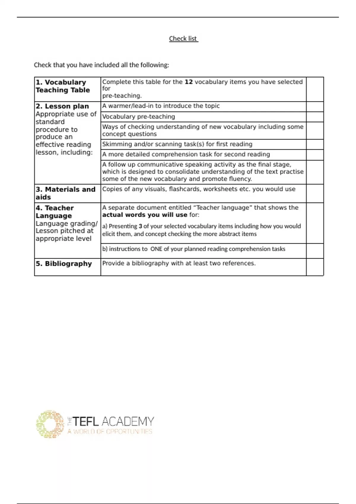 TEFL ACADEMY LEVEL 5 COURSE - Check list – How Assignment A will be assessed instructions
