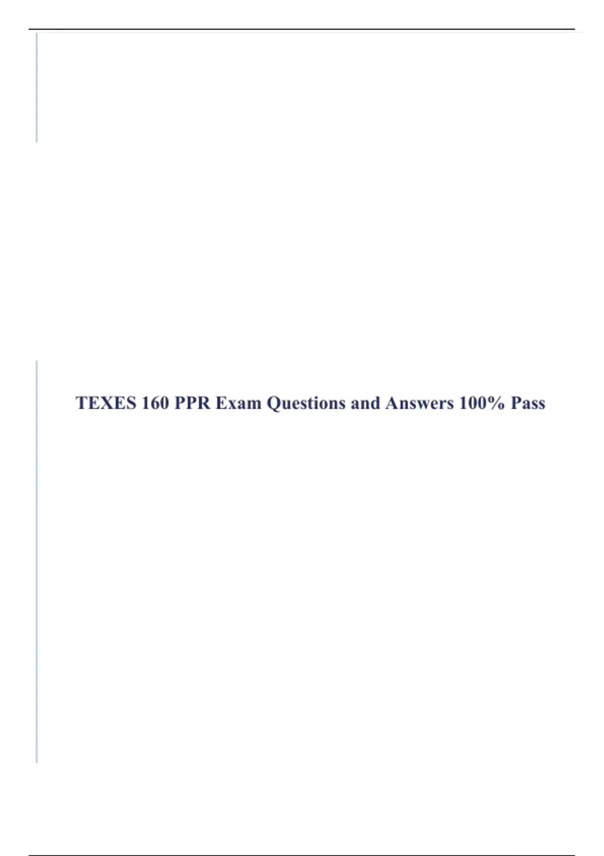 TEXES 160 PPR Exam Questions and Answers 100% Pass Which of the following rationales would a supporter of block scheduling provide to convince others to support the organizational structure? A. Teachers can focus on more subjects in a shorter time B. There is an emphasis on mastering facts and skills C. Students' time in quality learning situations is increased D. The responsibility for learning is shifted to the teachers C. Students' time in quality learning situations is increased Which of the following strategies best supports a teacher's goal to incorporate critical thinking skills into language arts lessons? A. Providing students with opportunities to seek additional content knowledge B. Creating a forum for students to debate points of view C. Having students individually summarize various literature read D. Asking students to create practice questions as a review activity B. Creating a forum for students to debate points of viewWhich THREE of the following are important factors to consider when establishing routines for cooperative group work? A. Goals to be met B. Daily schedule C. Classroom setting D. Individual accountability E. Equal opportunities A. Goals to be met and D. Individual accountability and E. Equal opportunities During class instruction, a middle school teacher realizes that most of the students are reluctant to participate in class discussions and give one-word answers when they of participate. Which of the following strategies is most effective for the teacher to use to increase student engagement? A. Having students answer questions on paper in class B. Giving students think time after asking probing questions C. Asking students to answer questions online for homework