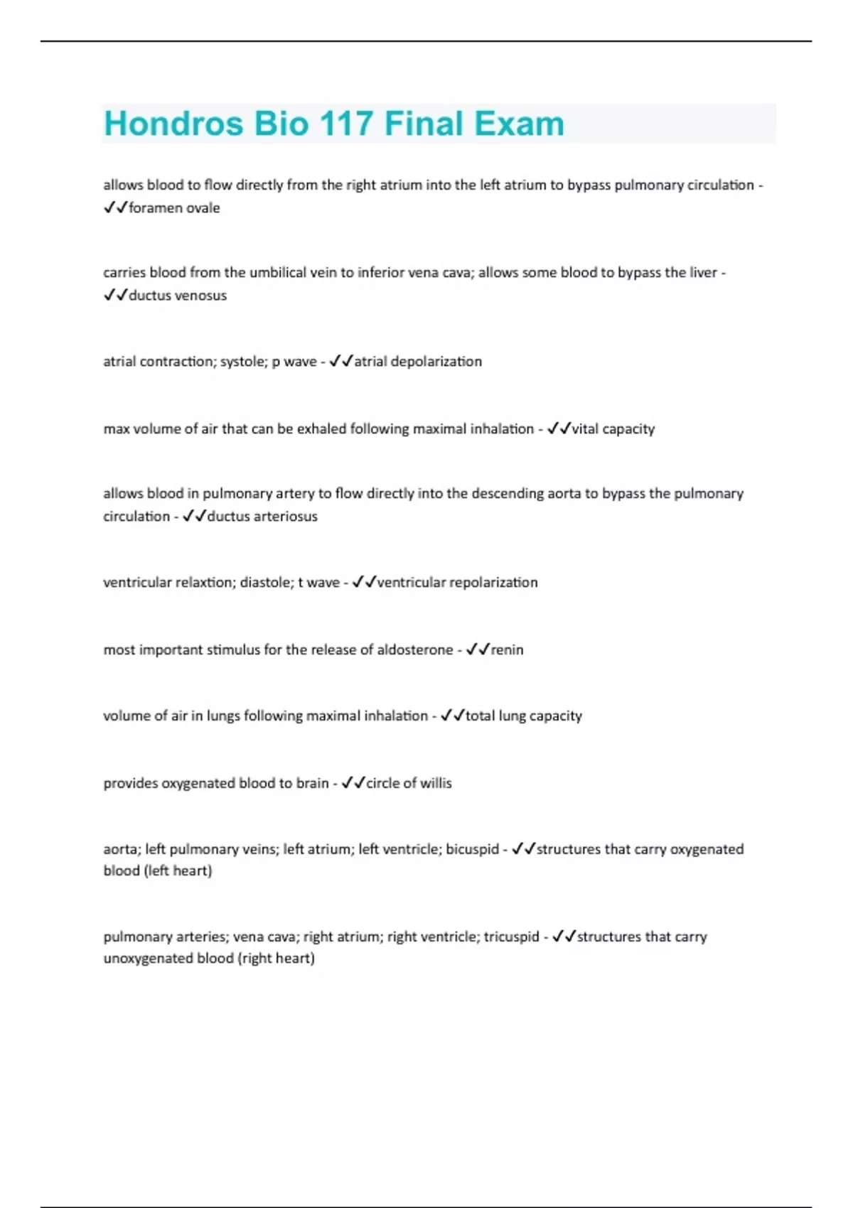 allows blood to flow directly from the right atrium into the left atrium to bypass pulmonary circulation - foramen ovale carries blood from the umbilical vein to inferior vena cava; allows some blood to bypass the liver - ductus venosus atrial contraction; systole; p wave - atrial depolarization max volume of air that can be exhaled following maximal inhalation - vital capacity allows blood in pulmonary artery to flow directly into the descending aorta to bypass the pulmonary circulation - ductus arteriosus ventricular relaxtion; diastole; t wave - ventricular repolarization most important stimulus for the release of aldosterone - renin volume of air in lungs following maximal inhalation - total lung capacity provides oxygenated blood to brain - circle of willis aorta; left pulmonary veins; left atrium; left ventricle; bicuspid - structures that carry oxygenated blood (left heart) pulmonary arteries; vena cava; right atrium; right ventricle; tricuspid - structures that carry unoxygenated blood (right heart)transport unoxygenated blood from the fetus to the placenta - umbilical arteries transports oxygenated blood from the placenta to the fetus - umbilical vein volume of air that remains in lung after forceful exhalation - residual volume ventricular contraction; systole; qrs complex - ventricular depolarization located between left ventricle and left aorta - aortic semilunar valve located between right ventricle and pulmonary artery - pulmonic semilunar