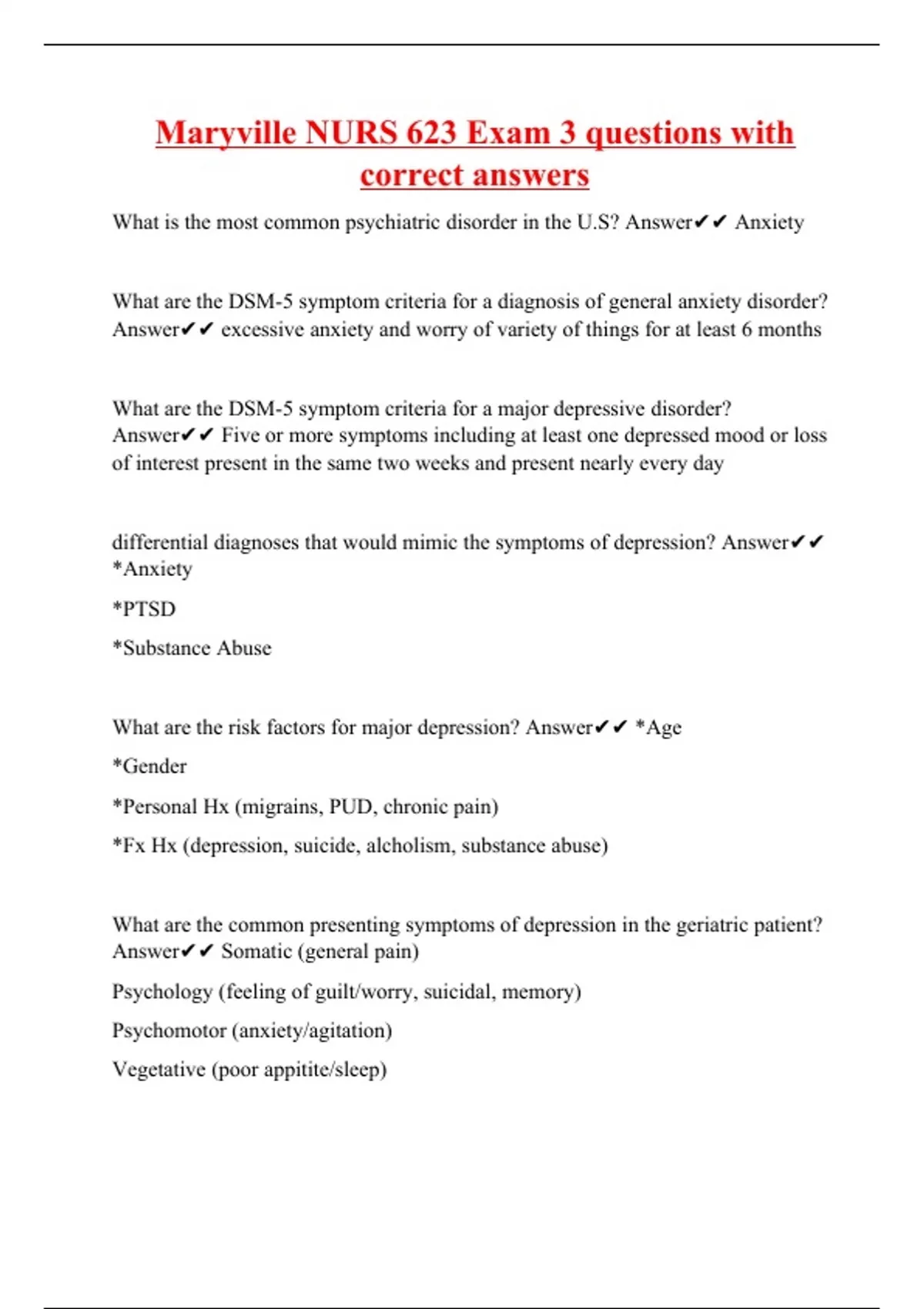 What is the most common psychiatric disorder in the U.S? Answer Anxiety What are the DSM-5 symptom criteria for a diagnosis of general anxiety disorder? Answer excessive anxiety and worry of variety of things for at least 6 months What are the DSM-5 symptom criteria for a major depressive disorder? Answer Five or more symptoms including at least one depressed mood or loss of interest present in the same two weeks and present nearly every day differential diagnoses that would mimic the symptoms of depression? Answer *Anxiety *PTSD *Substance Abuse What are the risk factors for major depression? Answer *Age *Gender *Personal Hx (migrains, PUD, chronic pain) *Fx Hx (depression, suicide, alcholism, substance abuse) What are the common presenting symptoms of depression in the geriatric patient? Answer Somatic (general pain) Psychology (feeling of guilt/worry, suicidal, memory) Psychomotor (anxiety/agitation) Vegetative (poor appitite/sleep)