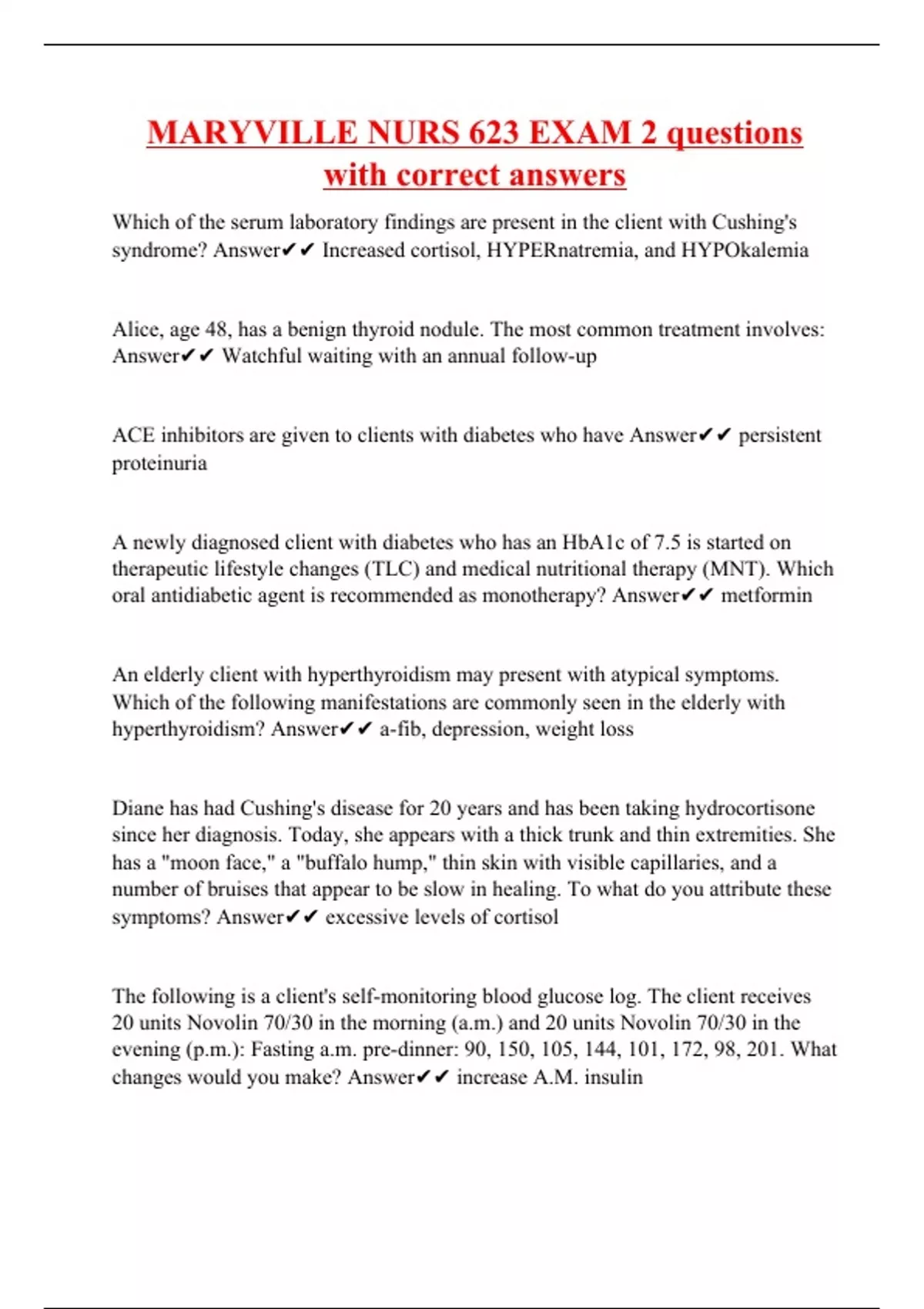Which of the serum laboratory findings are present in the client with Cushing's syndrome? Answer Increased cortisol, HYPERnatremia, and HYPOkalemia Alice, age 48, has a benign thyroid nodule. The most common treatment involves: Answer Watchful waiting with an annual follow-up ACE inhibitors are given to clients with diabetes who have Answer persistent proteinuria A newly diagnosed client with diabetes who has an HbA1c of 7.5 is started on therapeutic lifestyle changes (TLC) and medical nutritional therapy (MNT). Which oral antidiabetic agent is recommended as monotherapy? Answer metformin An elderly client with hyperthyroidism may present with atypical symptoms. Which of the following manifestations are commonly seen in the elderly with hyperthyroidism? Answer a-fib, depression, weight loss Diane has had Cushing's disease for 20 years and has been taking hydrocortisone since her diagnosis. Today, she appears with a thick trunk and thin extremities. She has a "moon face," a "buffalo hump," thin skin with visible capillaries, and a number of bruises that appear to be slow in healing. To what do you attribute these symptoms? Answer excessive levels of cortisol The following is a client's self-monitoring blood glucose log. The client receives 20 units Novolin 70/30 in the morning (a.m.) and 20 units Novolin 70/30 in the evening (p.m.): Fasting a.m. pre-dinner: 90, 150, 105, 144, 101, 172, 98, 201. What changes would you make? Answer increase A.M. insulin