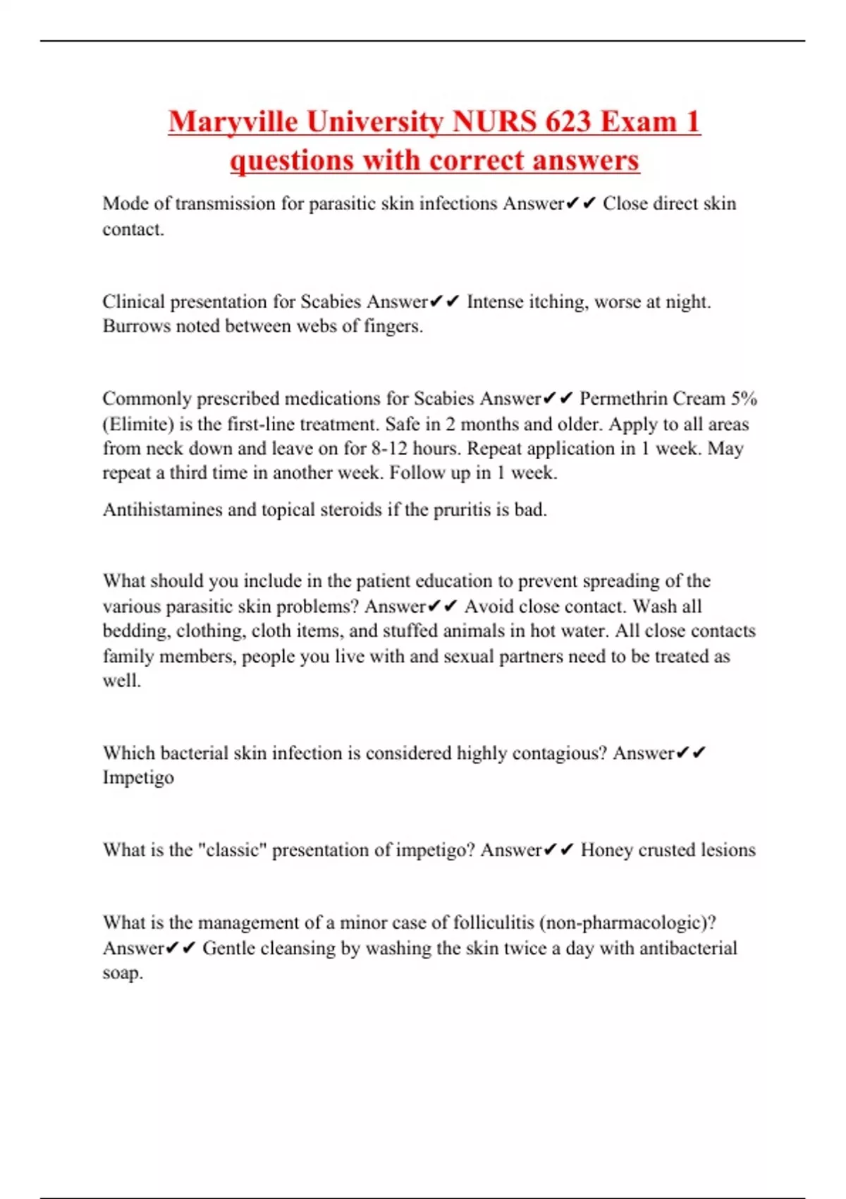 Mode of transmission for parasitic skin infections Answer Close direct skin contact. Clinical presentation for Scabies Answer Intense itching, worse at night. Burrows noted between webs of fingers. Commonly prescribed medications for Scabies Answer Permethrin Cream 5% (Elimite) is the first-line treatment. Safe in 2 months and older. Apply to all areas from neck down and leave on for 8-12 hours. Repeat application in 1 week. May repeat a third time in another week. Follow up in 1 week. Antihistamines and topical steroids if the pruritis is bad. What should you include in the patient education to prevent spreading of the various parasitic skin problems? Answer Avoid close contact. Wash all bedding, clothing, cloth items, and stuffed animals in hot water. All close contacts family members, people you live with and sexual partners need to be treated as well. Which bacterial skin infection is considered highly contagious? Answer Impetigo What is the "classic" presentation of impetigo? Answer Honey crusted lesions What is the management of a minor case of folliculitis (non-pharmacologic)? Answer Gentle cleansing by washing the skin twice a day with antibacterial soap.