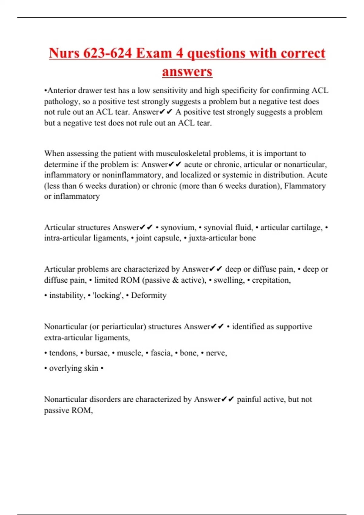•Anterior drawer test has a low sensitivity and high specificity for confirming ACL pathology, so a positive test strongly suggests a problem but a negative test does not rule out an ACL tear. Answer A positive test strongly suggests a problem but a negative test does not rule out an ACL tear. When assessing the patient with musculoskeletal problems, it is important to determine if the problem is: Answer acute or chronic, articular or nonarticular, inflammatory or noninflammatory, and localized or systemic in distribution. Acute (less than 6 weeks duration) or chronic (more than 6 weeks duration), Flammatory or inflammatory Articular structures Answer • synovium, • synovial fluid, • articular cartilage, • intra-articular ligaments, • joint capsule, • juxta-articular bone Articular problems are characterized by Answer deep or diffuse pain, • deep or diffuse pain, • limited ROM (passive & active), • swelling, • crepitation, • instability, • 'locking', • Deformity Nonarticular (or periarticular) structures Answer • identified as supportive extra-articular ligaments, • tendons, • bursae, • muscle, • fascia, • bone, • nerve, • overlying skin • Nonarticular disorders are characterized by Answer painful active, but not passive ROM, • demonstrated point or focal ternderness in regions distinct from articular structures,