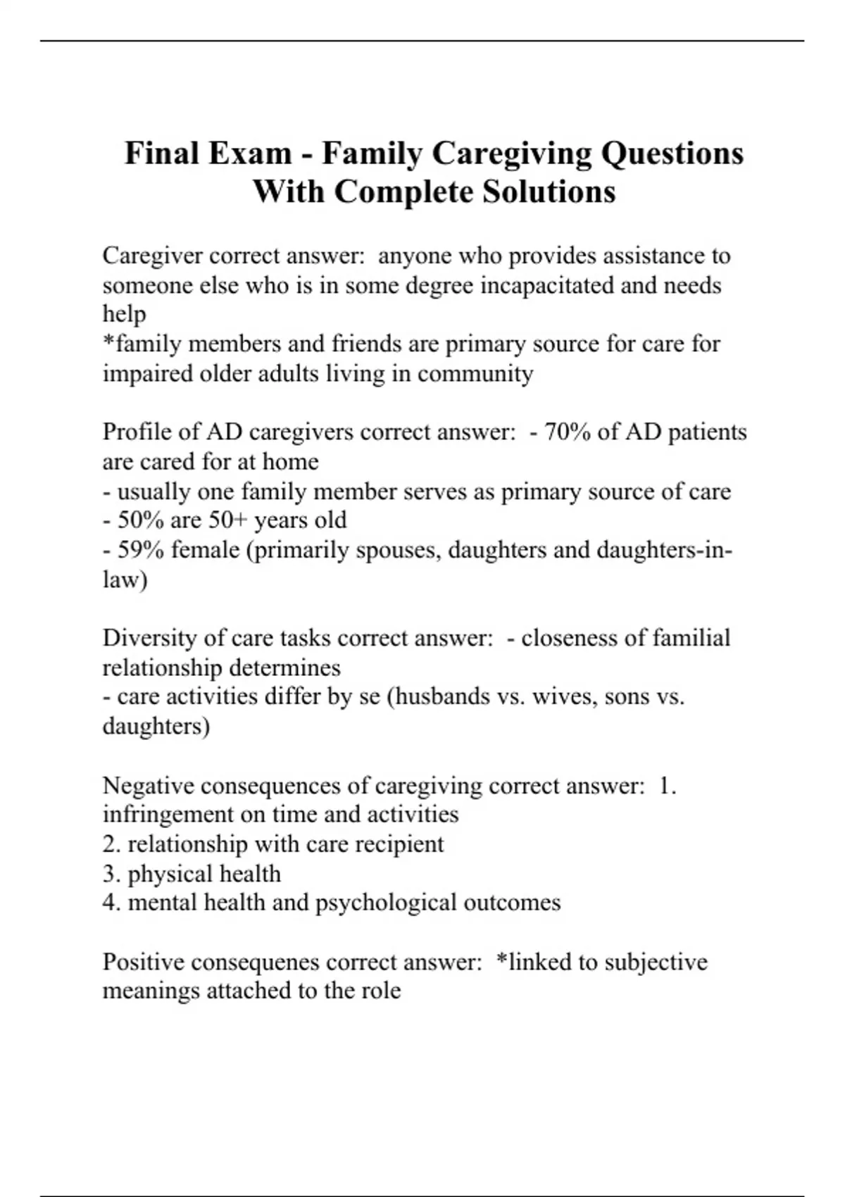 Final Exam - Family Caregiving Questions With Complete Solutions