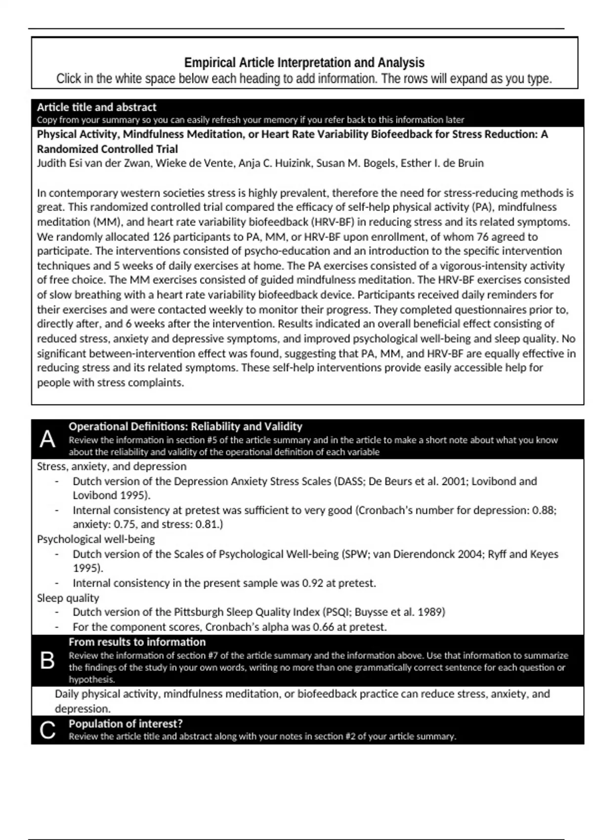 Operational Definitions: Reliability and Validity Review the information in section #5 of the article summary and in the article to make a short note about what you know about the reliability and validity of the operational definition of each variable Stress, anxiety, and depression - Dutch version of the Depression Anxiety Stress Scales (DASS; De Beurs et al. 2001; Lovibond and Lovibond 1995).