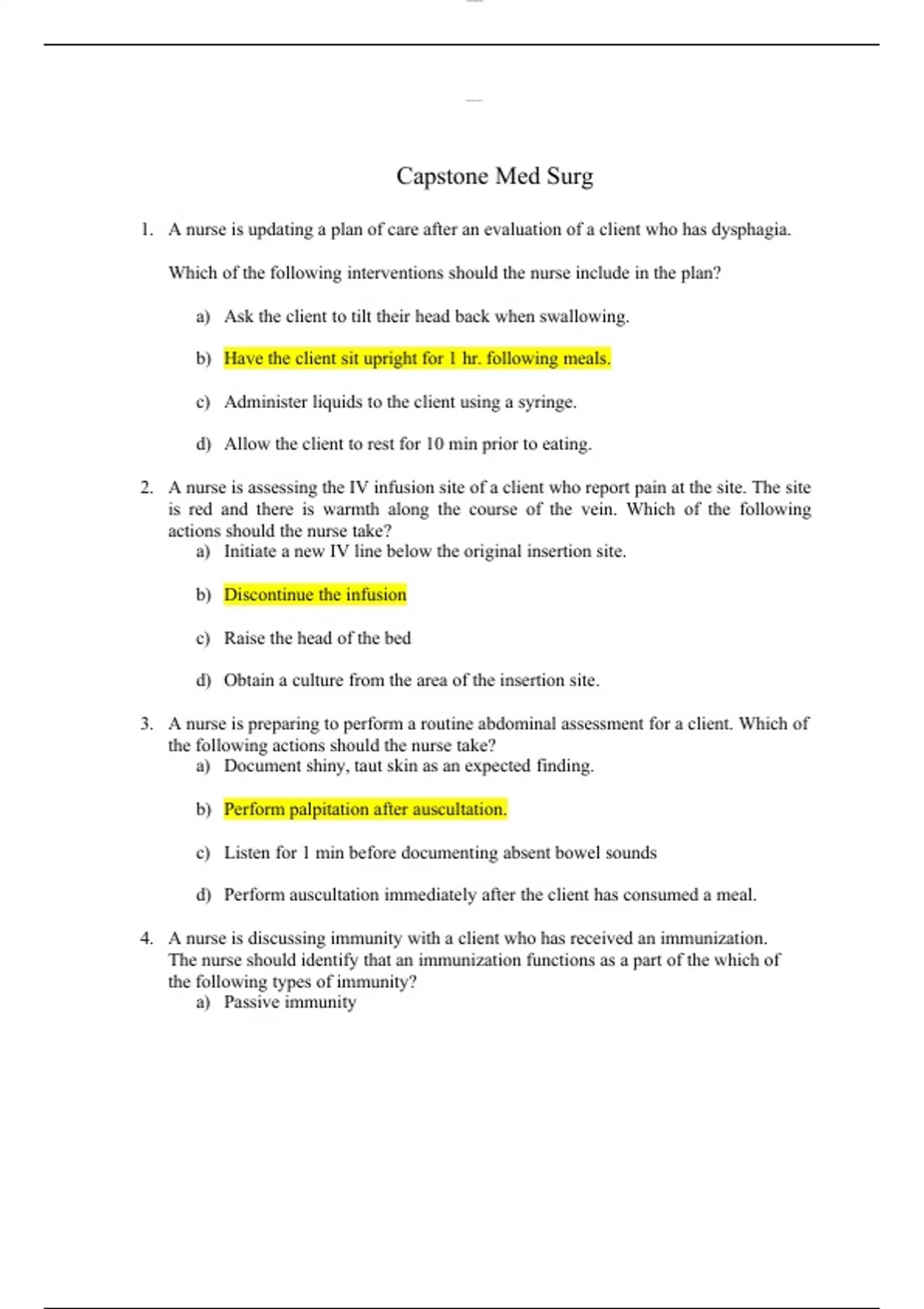 1. A nurse is updating a plan of care after an evaluation of a client who has dysphagia. Which of the following interventions should the nurse include in the plan? a) Ask the client to tilt their head back when swallowing. b) Have the client sit upright for 1 hr. following meals. c) Administer liquids to the client using a syringe. d) Allow the client to rest for 10 min prior to eating. 2. A nurse is assessing the IV infusion site of a client who report pain at the site. The site is red and there is warmth along the course of the vein. Which of the following actions should the nurse take? a) Initiate a new IV line below the original insertion site. b) Discontinue the infusion c) Raise the head of the bed d) Obtain a culture from the area of the insertion site. 3. A nurse is preparing to perform a routine abdominal assessment for a client. Which of the following actions should the nurse take? a) Document shiny, taut skin as an expected finding. b) Perform palpitation after auscultation. c) Listen for 1 min before documenting absent bowel sounds d) Perform auscultation immediately after the client has consumed a meal. 4. A nurse is discussing immunity with a client who has received an immunization. The nurse should identify that an immunization functions as a part of the which of the following types of immunity? a) Passive immunity b) Active immunity c) Cellular immunity d) Acquired immunity 5. A nurse is reviewing the medical records of a group of older adult clients. The nurse should identify that which of the following is a risk factor that places older clients at an increased risk for developing infections? a) Overproduction of lymphocytes b) Elevated albumin levels c) Lowered immune system function d) Increased body fat 6. A nurse is teaching a client who has asthma the use of a metered dose inhaler. Which of the following instructions should the nurse include in the teaching? a) Hold your breath for 6 seconds after inhaling the medication. b) Inhale the medication deeply for 5 seconds. c) Do not shake the medication in the inhaler d) Hold the inhaler 3 inches away from your mouth. 7. A nurse is performing a focused assessment on a client who has a history of COPD and is experiencing dyspnea. Which of the following findings should the nurse expect? a) Pulse oximetry reading of 95 % b) Decreased depth of respirations c) Flaring of the nostrils d) Respiratory rate of 16/min 8. A nurse is teaching a client about the correct use of a cane. Which of the following instruction should the nurse include in the teaching? (Selected all that apply) a) Ensure the cane has a rubber cap. b) Hold the cane on the weaker side. c) Flex the elbow slightly when using the cane. d) Move the cane and stronger leg forward simultaneously e) Use a quad cane for increased support. 9. A nurse is teaching a group of assistive personnel about the expected integumentary changes in older adult clients. Which of the following findings should the nurse include in the teaching? a) Increase in subcutaneous tissue b) Decrease in pigmentation c) Increase in moisture levels d) Decrease in elasticity